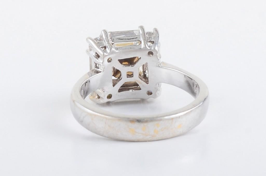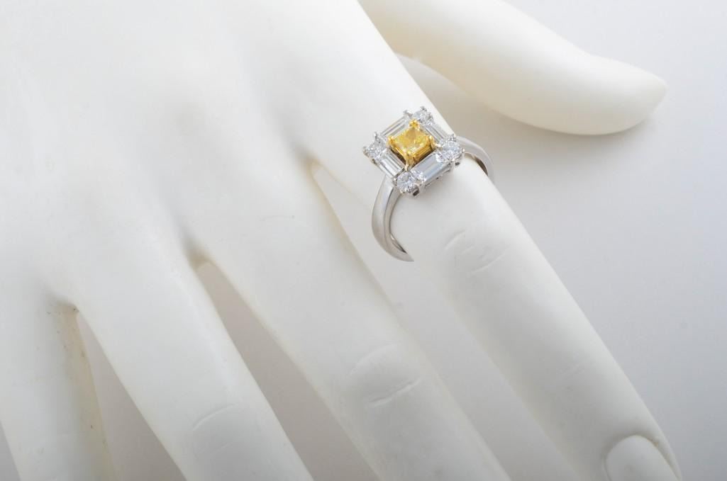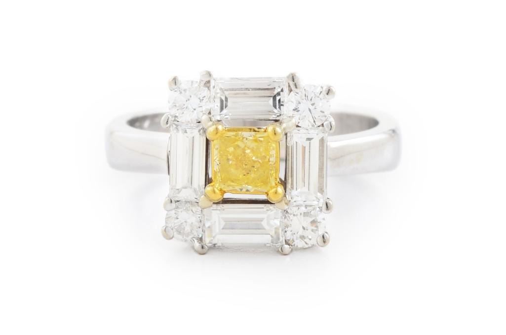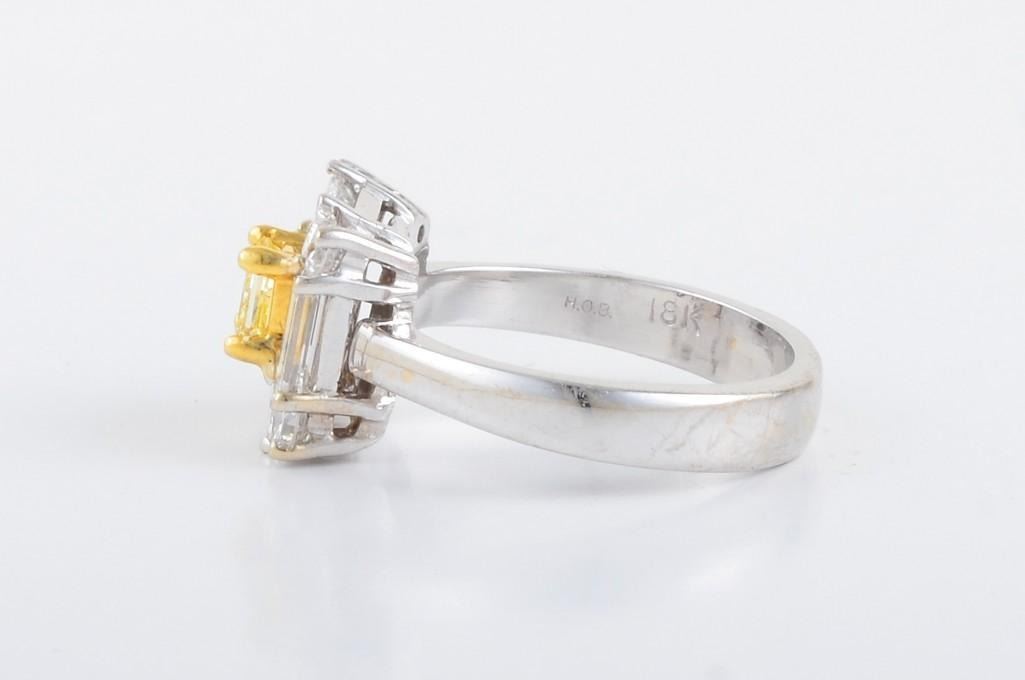 18K white gold ring with a central 0.4 carat fancy natural yellow diamond color, I1 clarity, surrounded by round and baguette diamonds, VVS clarity, F color, totaling approximately 1 carat. Stamped H.O.B, for House of Baguettes, 18K. Ring size 6 3/4. Weight 6.7g.