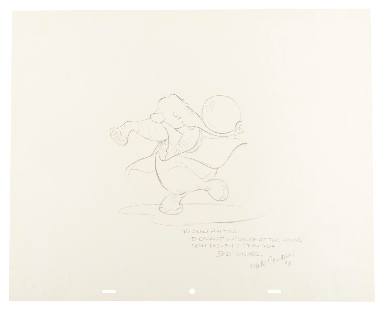 (Grundeen, 1981) A drawing of an Elephant from the Dance of the Hours segment of “Fantasia” by Frank Grundeen, signed with a dedication “To Alan Hylton.” Grundeen was the second artist to draw the popular “Donald Duck” newspaper comic strip. With a character image size of 5.75” x 7” on a 12.5” x 15.5” piece of drawing paper, the piece displays in good condition with heavy creases throughout.