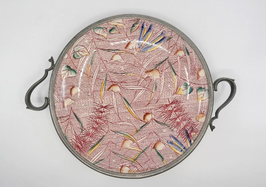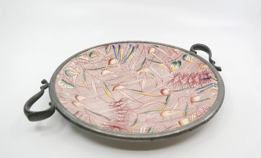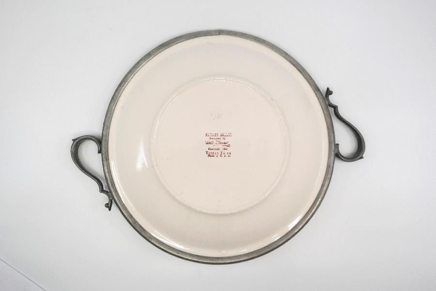 (Vernon Kilns, 1940) A ceramic plate in the"Fantasia" Milkweed Ballet floral pattern designed by Disney Studio artist Gyo Fujikawa, with a metal serving rim. Measuring 12.25" in diameter, the ceramic plate is in very good condition with light wear from age.