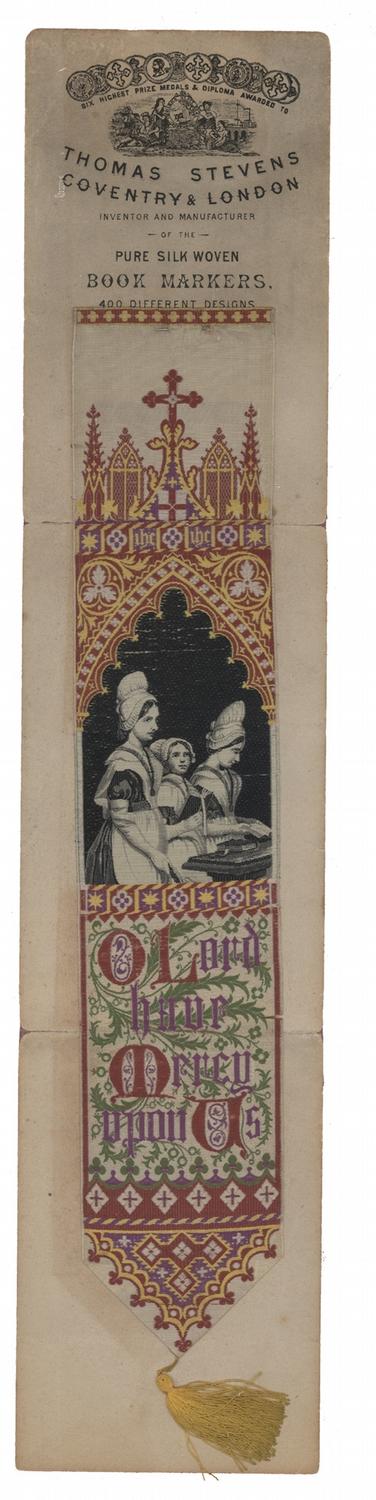 3 ¼” X 15”. A choice advertising item for Thomas Stevens being an imprinted paper “Thomas Stevens Coventry & London, Inventor and Manufacturer of Pure Silk Woven Book markers and Different Designs.” Attached with a pin at top is the original large Stevensgraph ribbon as an integral part of the advertisement providing an example of the company’s fine work. The ribbon depicts a church motif with three woman apparently viewing bibles upon a podium with the words “O Lord have Mercy Upon Us.” A choice advertising item from Stevens, known for some of the finest work of this type. Couple of folds.
