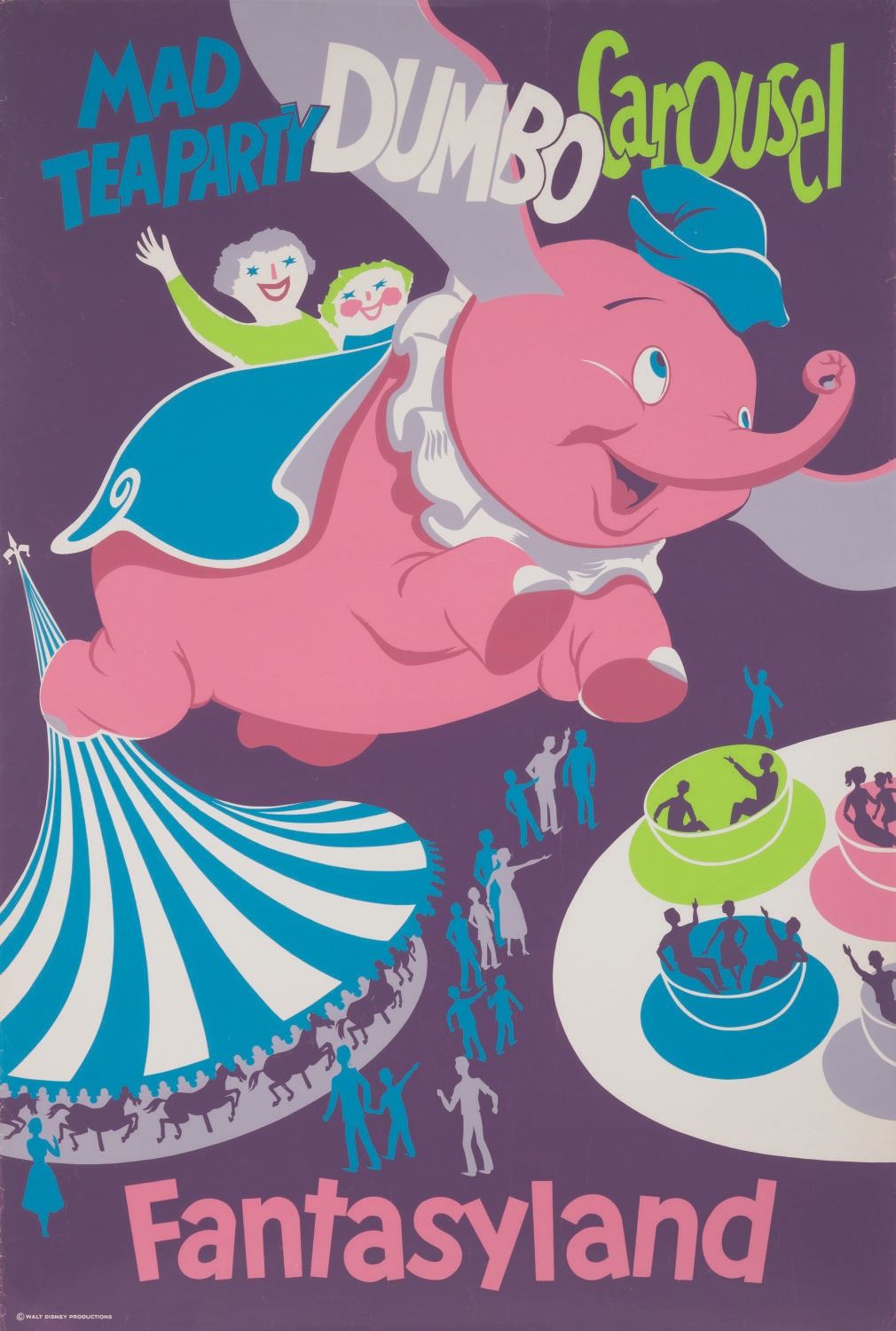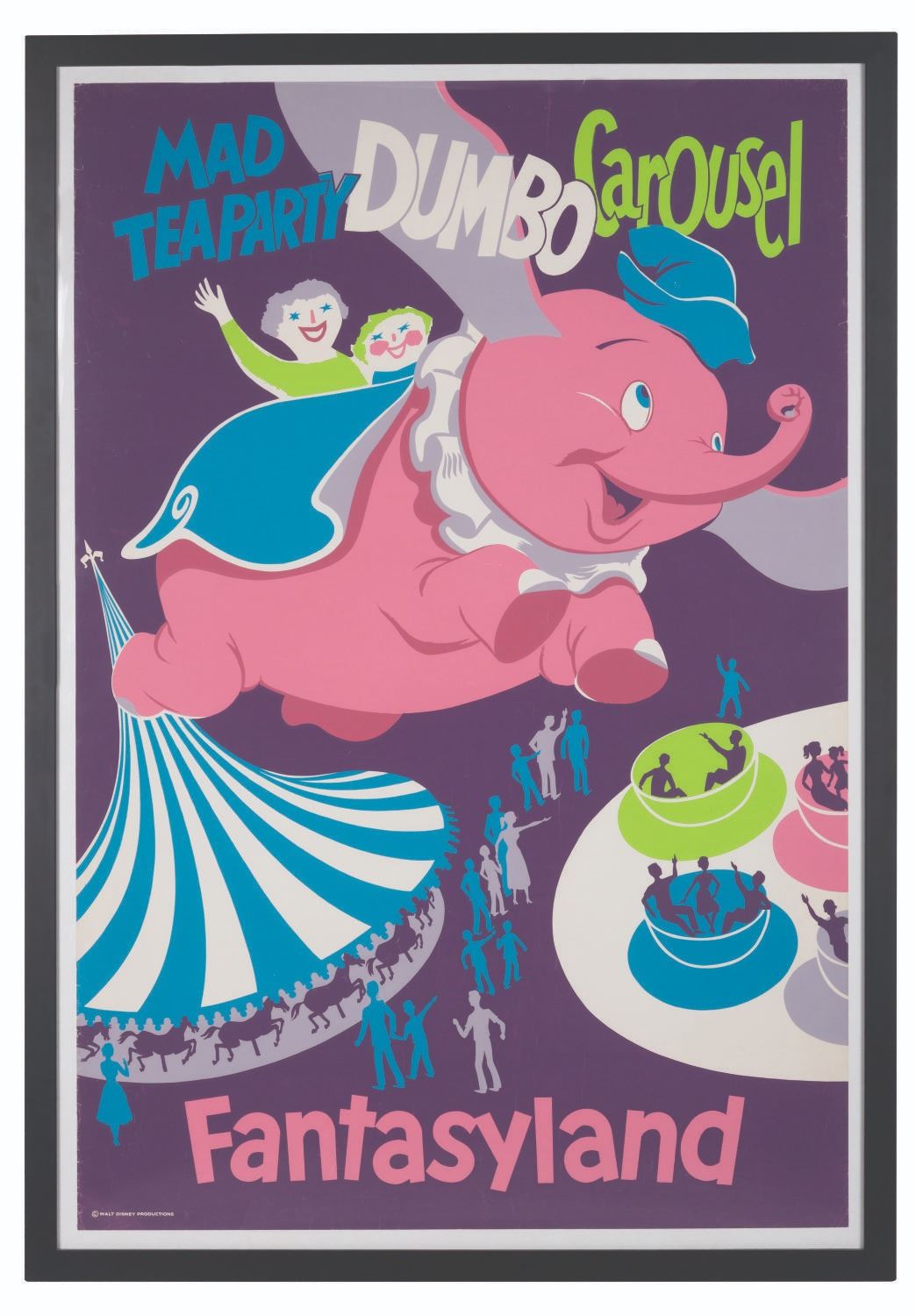 (Disneyland, 1956) An original hand silk-screened poster for the Mad Tea Party, King Arthur Carrousel, and Dumbo the Flying Elephant in Fantasyland at Disneyland. Designed by Bjorn Aronson, the iconic poster was one of the first to decorate the Park. Measuring 36" x 54" the poster is in very good condition with mild scuffs, creases, and edge wear including small tears. The poster has been linen-backed for its continued preservation, which has mitigated the tears.