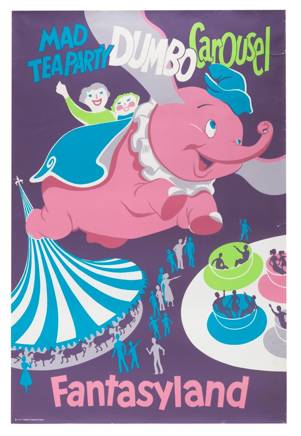 (Disneyland, 1956) An original hand silk-screened poster for the Mad Tea Party, King Arthur Carrousel, and Dumbo the Flying Elephant in Fantasyland at Disneyland. Designed by Bjorn Aronson, the iconic poster was one of the first to decorate the Park. Measuring 36" x 54", the poster displays in good condition with significant edge wear including a 2" and a 1" tear both in the right edge, a few small scractches and scuffs throughout, and very light rippling from exposure to moisture that is only visible from the back side.