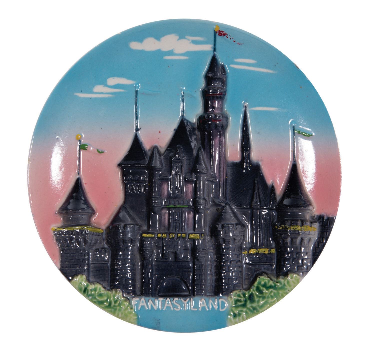 (Disneyland, 1955) An early bas relief souvenir wall plate from Disneyland. The painted and glazed ceramic plate features sculpted relief of Sleeping Beauty Castle, foliage, and Fantasyland lettering. The reverse retains a Disneyland stamp. Measuring 8.5" in diameter, the plate is in very good condition with minor, unobtrusive crazing to the glaze.