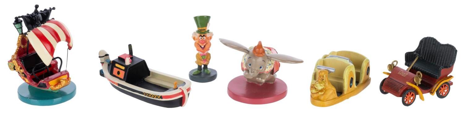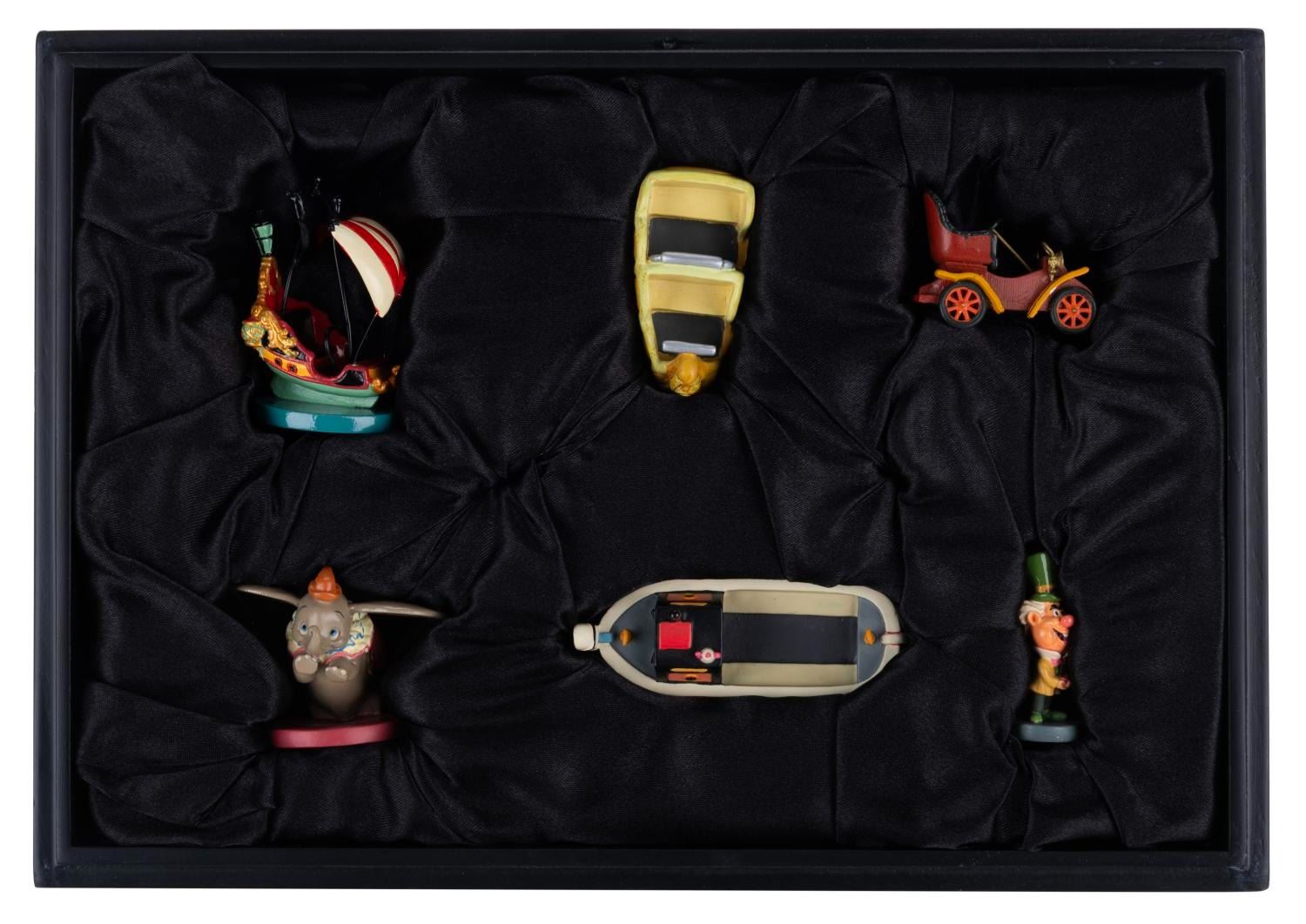 (Disneyland, 2005) A limited edition boxed set of Fantasyland-themed pewter miniatures designed by Kevin Kidney and Jody Daily for Disneyland's 50th anniversary. This set was limited to 1500 pieces and includes miniatures of a Dumbo ride vehicle, a Peter Pan vehicle, an Alice in Wonderland vehicle, a Storybookland boat, a Mr. Toad vehicle, and a Mad Hatter costumed character. This boxed set measures 7"x10" and 3.5" tall, and is in very good condition with minimal wear. The Peter Pan vehicle displays minor paint loss on one of the sails.