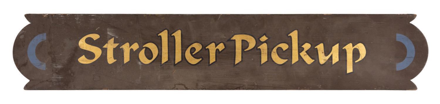 (Walt Disney World, 1990s) A sign making Guests aware of the Stroller Pickup Area near the Fantasyland Skyway Station. This piece was removed during a rehabilitation of the area or upon its closure in 1999. Measuring 32"x6" and 1.5" wide, the hand painted wooden sign is in good condition with small cracks, chips, scuffs, and wear throughout from Park display and exposure, handling, and age.