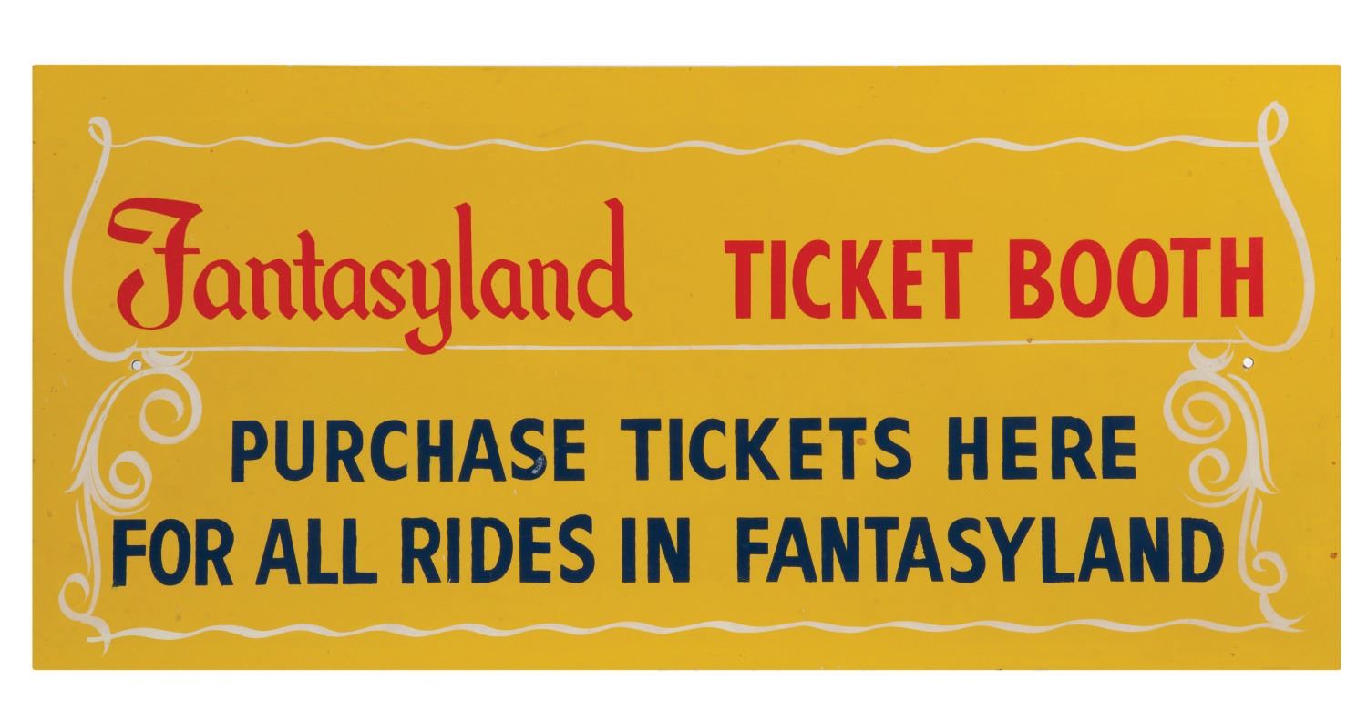 (Disneyland, 1960s/70s) A Fantasyland Central Ticket Booth sign. The sign features hand-painted letters on masonite and was once attached to one of six sides of a fantasyland ticket booth in use until the 1970s. Measuring 13.5"x29.25", the sign displays in good condition, despite scuffs and wear from park use.