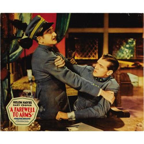 <B>A Farewell to Arms (Paramount, 1932).</B></I> Jumbo Lobby Card (14" X 17"). This jumbo lobby card depicts Gary Cooper (the love-struck Lieutenant) and his adversary, Adolphe Menjou, who has been doing everything in his power to keep Cooper away from the love of his life, played by Helen Hayes. This was the first version of Ernest Hemingway's novel to reach the screen. This jumbo lobby has pinholes in the corners and some stress and wear to the corners. Very Fine-. <BR><BR><b>Shipping:</b> Flat Material, Large (<a target="_blank" href="http://www.heritageauctions.com/common/shipping.php">view shipping information</a>)