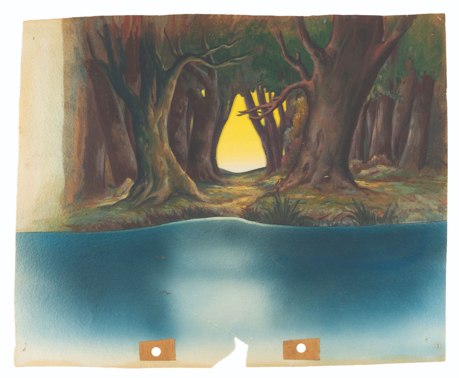 (Schlesinger, 1941) An original hand-painted production background of a forest and lake from the bird scene in “Farm Frolics.” Accomplished in gouache and measuring 10” x 12, the background is in good condition with light stains, scratches, pinholes from production use, discoloration from age, cracks, and a 1” x 1” section missing from the bottom center.