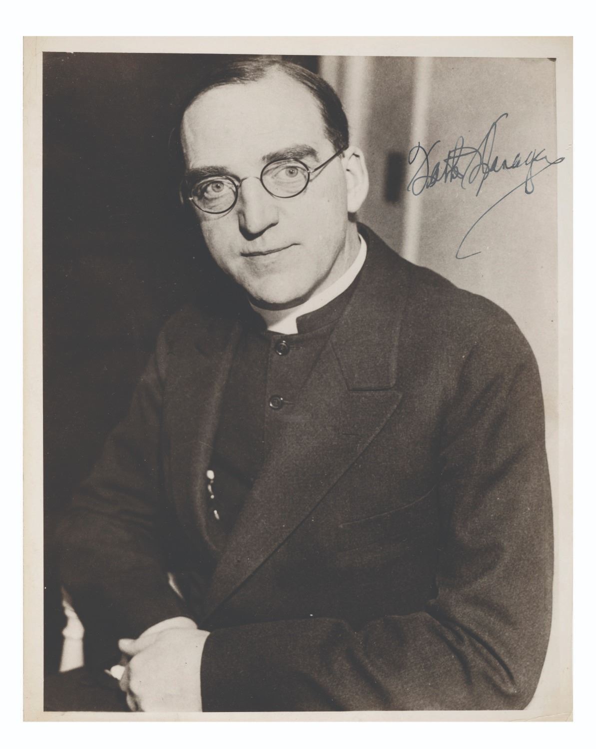 (Flanagan, 1930s-40s) A signed photograph of Father Flanagan, best known for founding the Boys Town orphanage and educational complex in Nebraska. Spencer Tracy portrayed Flanagan in the 1938 film"Boys Town." Measuring 8" x 10", the photo is in very good condition with light handling wear and slight toning from age, and comes with a Letter of Authenticity from James Spence Authentication.