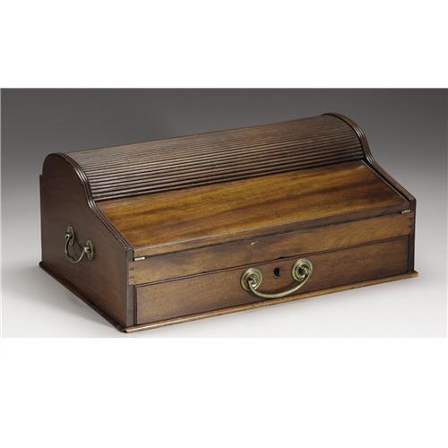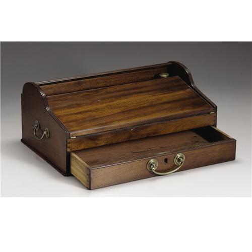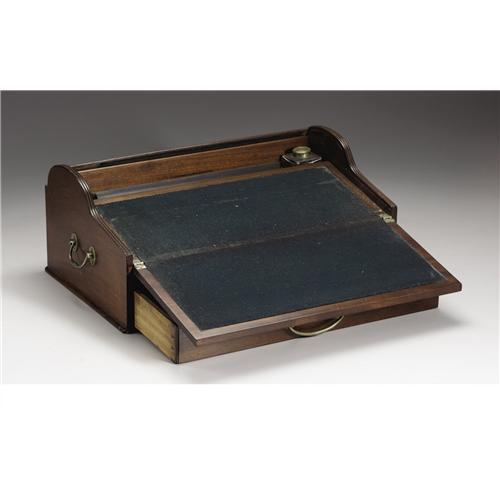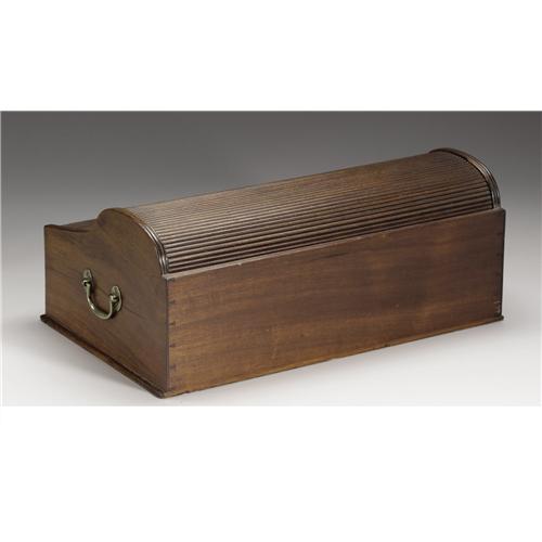 <B>A Federal Mahogany Tambour Top Lap Desk</B></I><BR><BR>Unknown maker, possibly Massachusetts<BR>Mahogany, brass, felt<BR>Unmarked<BR>6.25 in. high x 16 in. wide x 10.12 in. deep<BR><BR>Of partial tambour top form, with one drawer which when opened triggers the tambour device, flip down writing panel with green felt surface; brass bail handles at side and front of drawer.<BR>