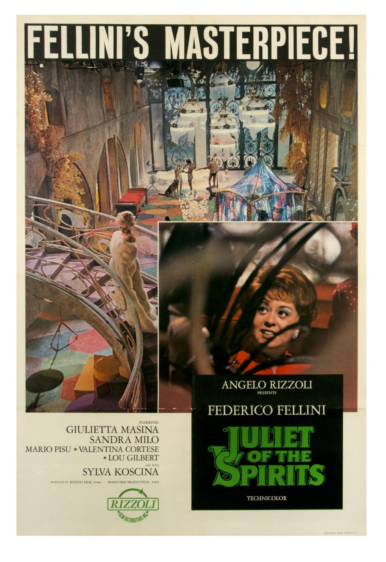 (Rizzoli, 1965) An original US theatrical one-sheet for Federico Fellini’s masterpiece “Juliet of the Spirits” starring his wife, Giulietta Masina. Measuring 27” x 40.75”, the poster is mounted to a heavy paper backing and is in very good condition with light soiling, creasing, color loss at the fold joints, and discoloration.