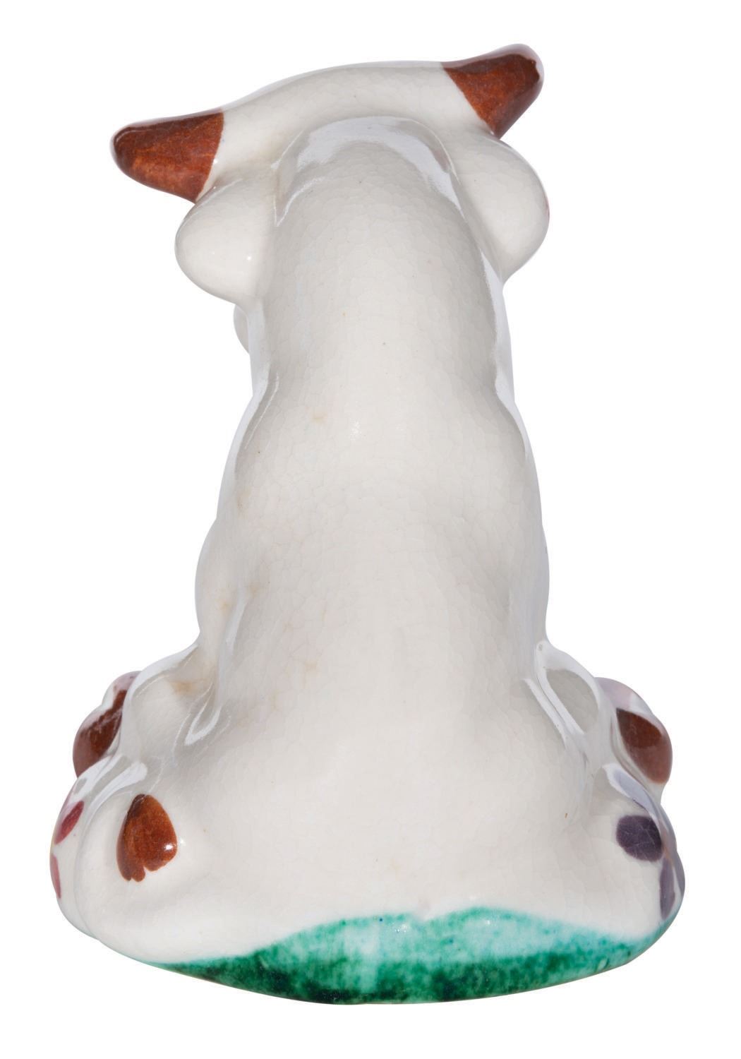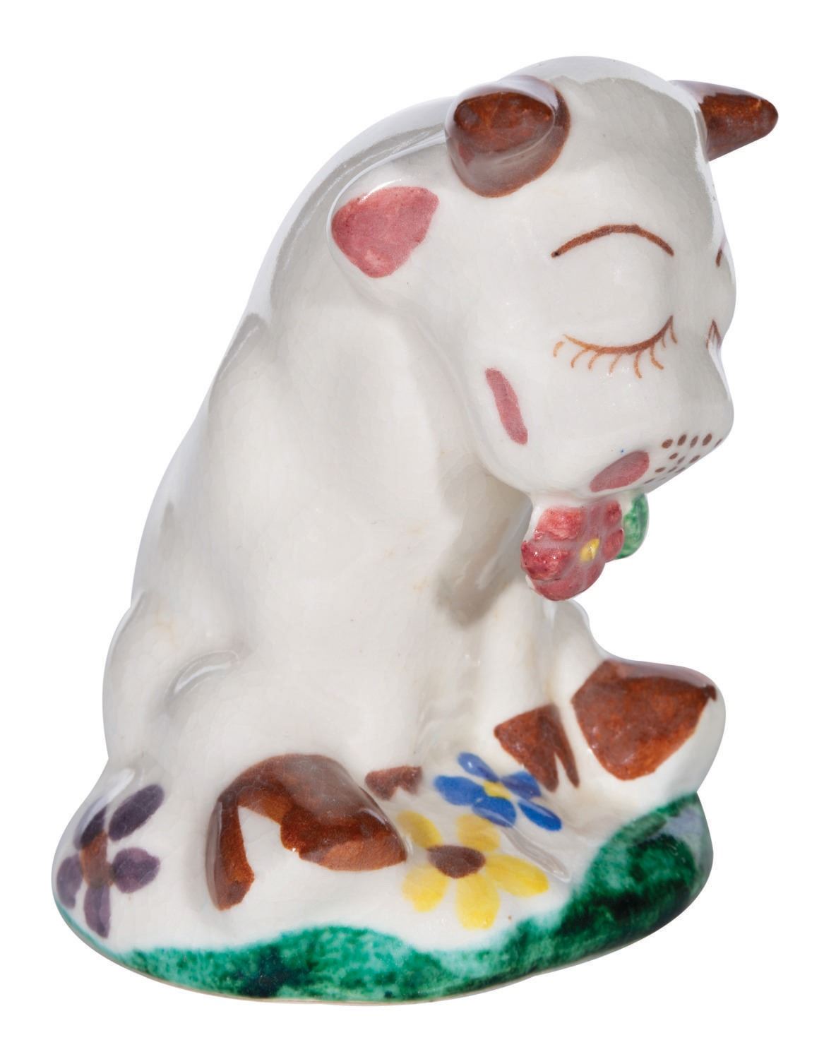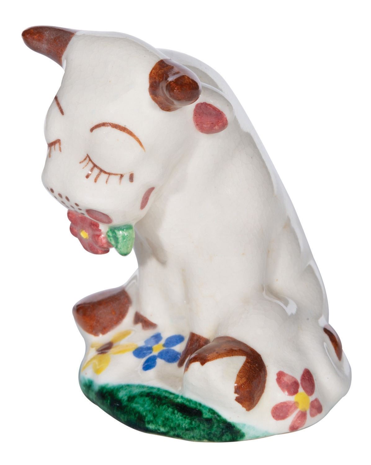 (1930's) A ceramic figure of Ferdinand the Bull. While this bears a strong resemblance to de Lee Art figures, it does not bear their copyright stamp on the bottom, and slight differences suggest this is an imitator. Measuring 4" tall, the figure is in very good condition with light crazing.