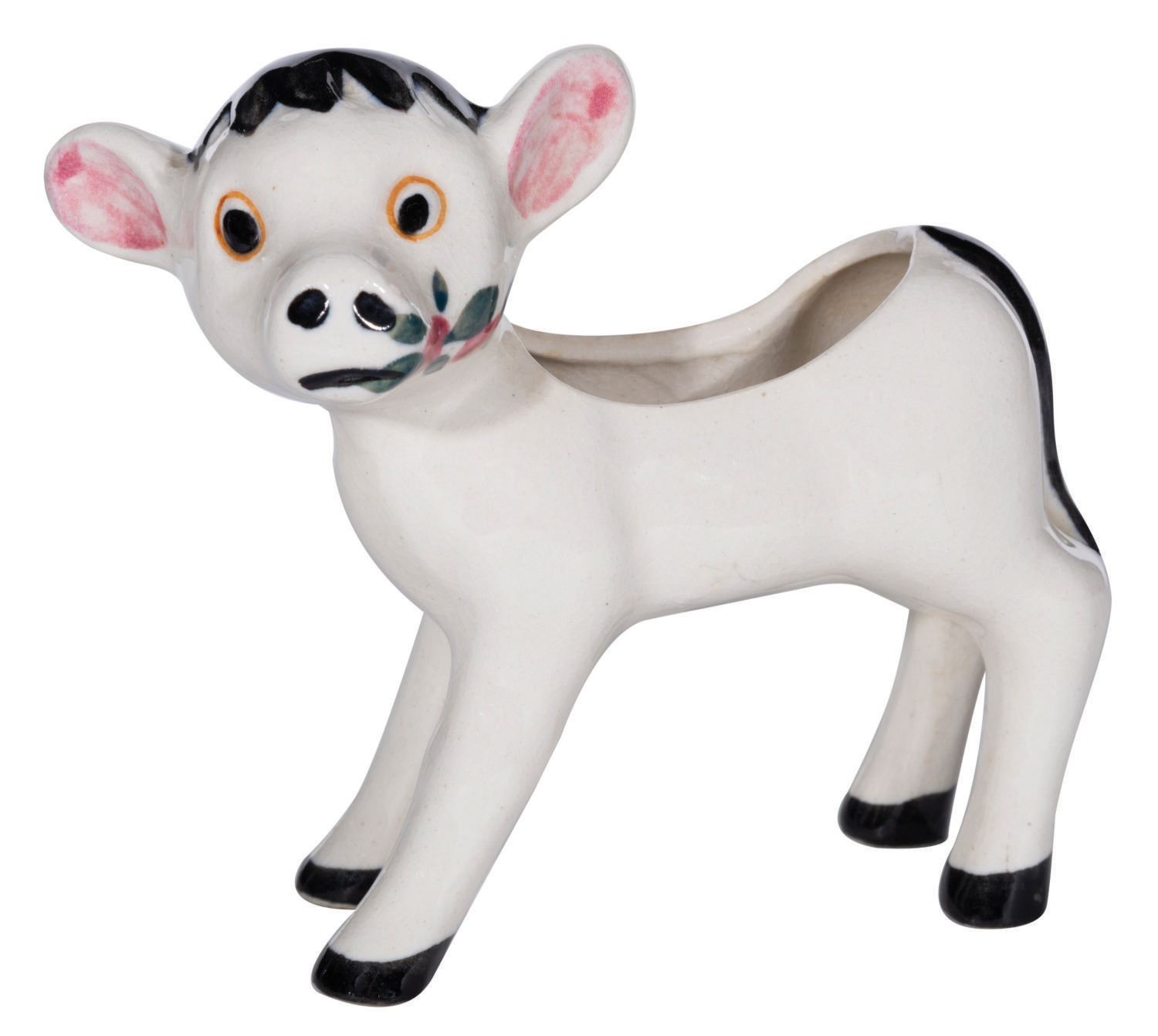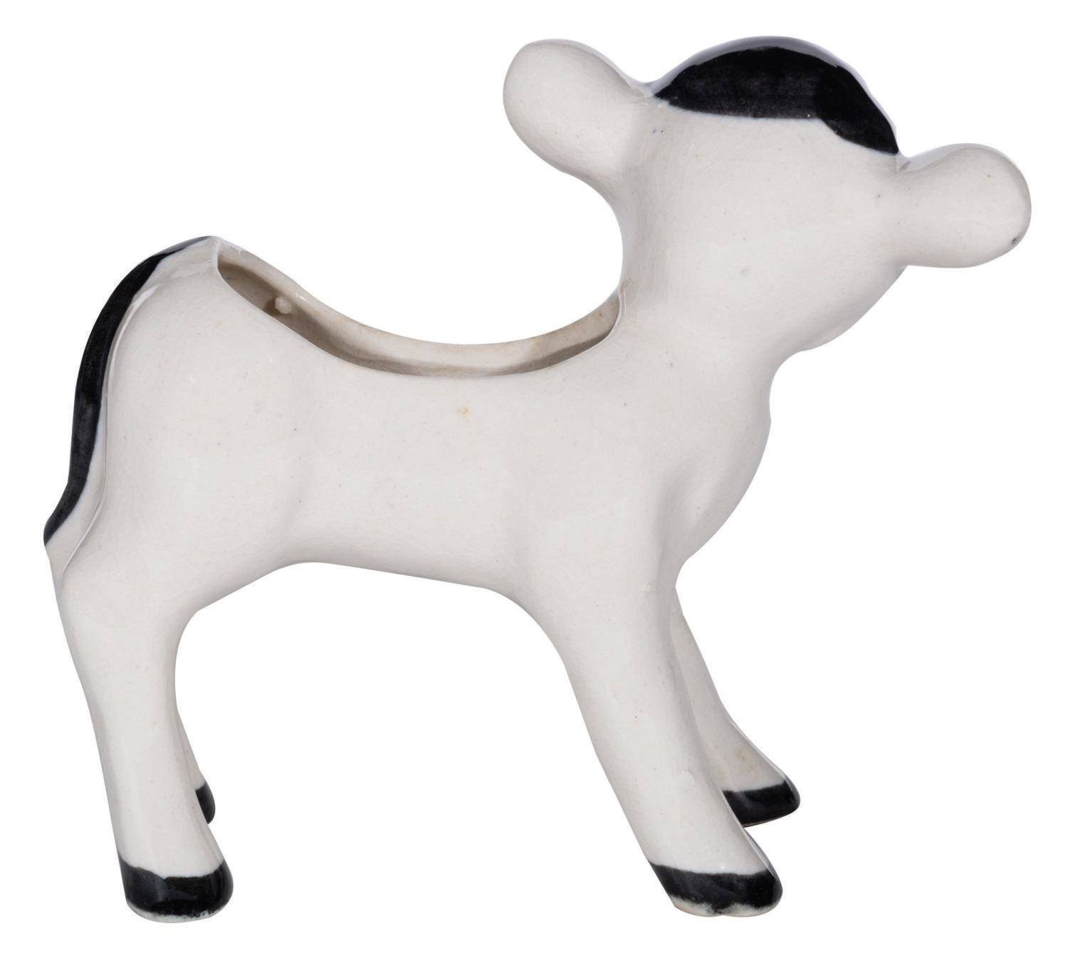 (Japan, 1940s) A painted glazed figural ceramic planter of young Ferdinand, inspired by Disney's "Ferdinand the Bull" animated short released in 1938. This piece is stamped as being produced in Occupied Japan, which dates it to between 1945 and 1951. Measuring 2.5"x5.5"x4.5" high, the piece is in very good condition, with crazing, and some wear from display.