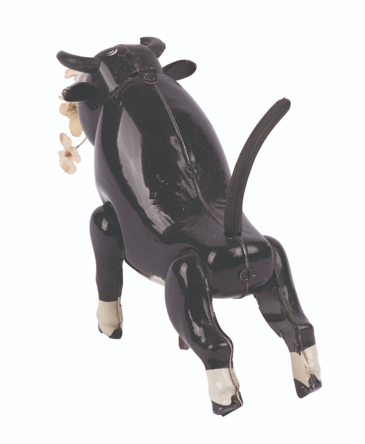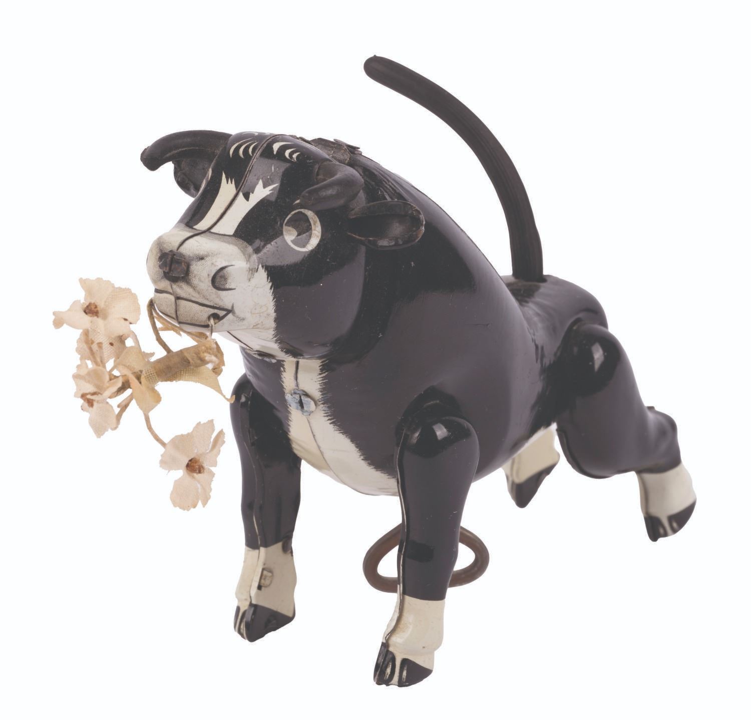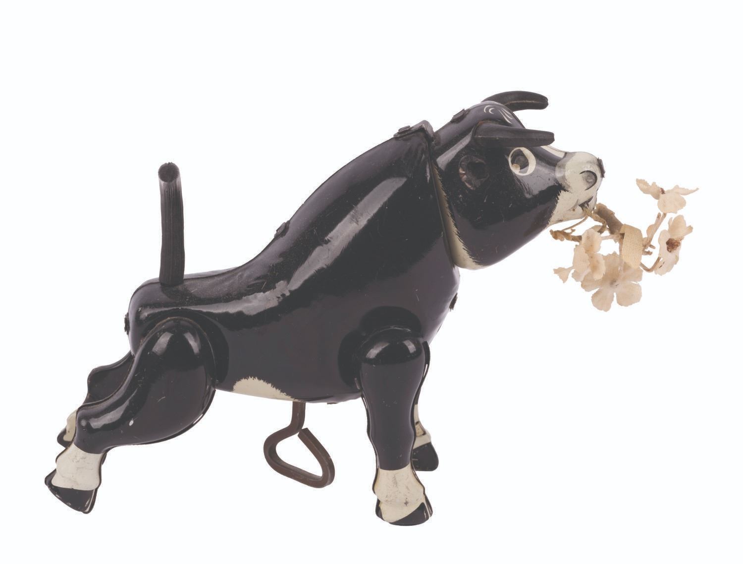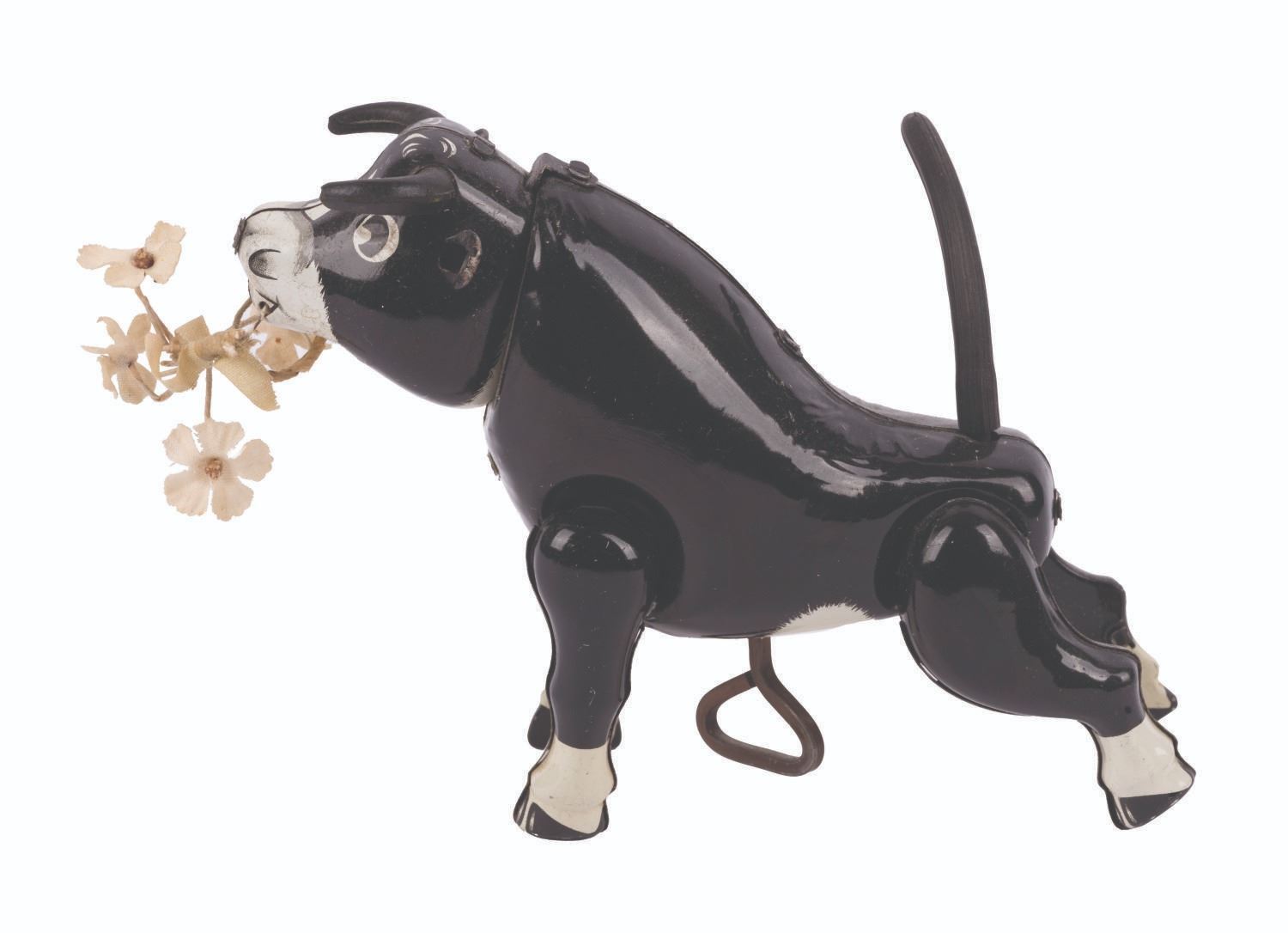 (LineMar, 1938-40s) A "Mechanical Fierce Ferdinand the Bull" wind-up toy featuring a twirling tail, bucking head, and shuffling feet. Measuring 6.5” x 2” x 4.25” high, the toy is in very good working condition, with light wear mainly to the flowers.