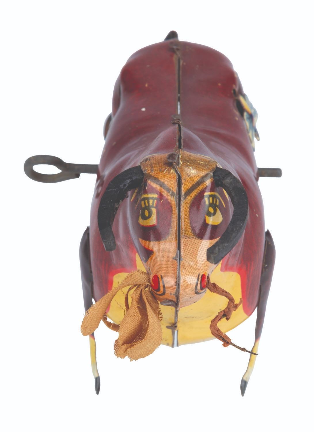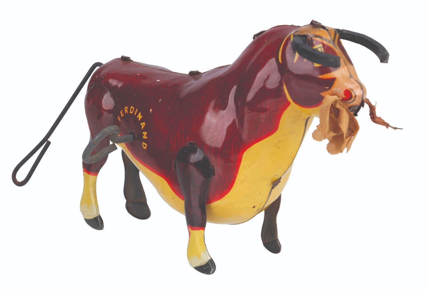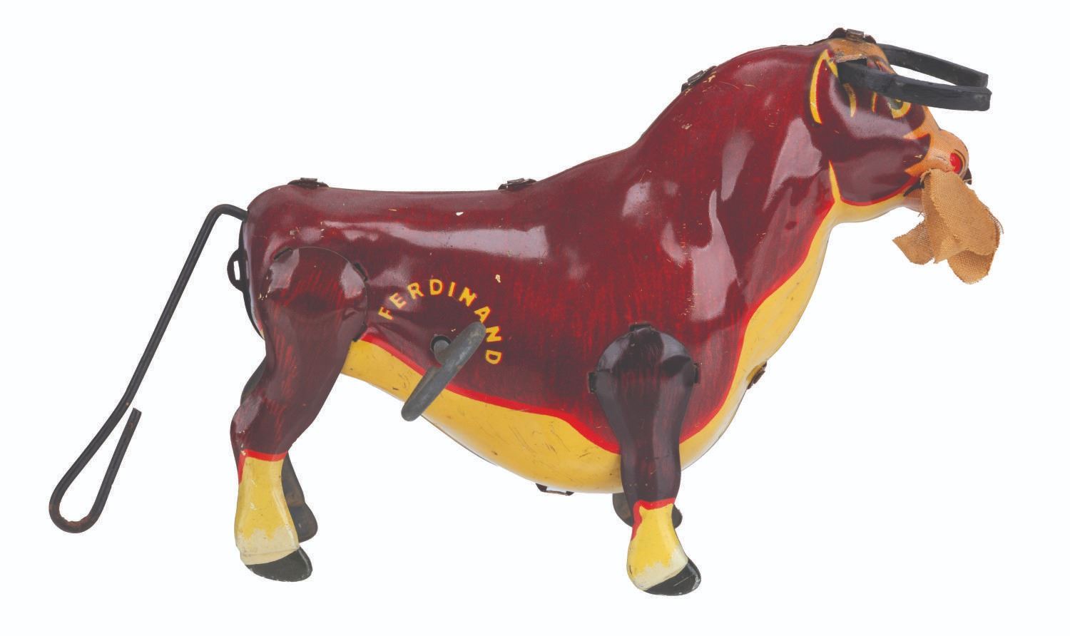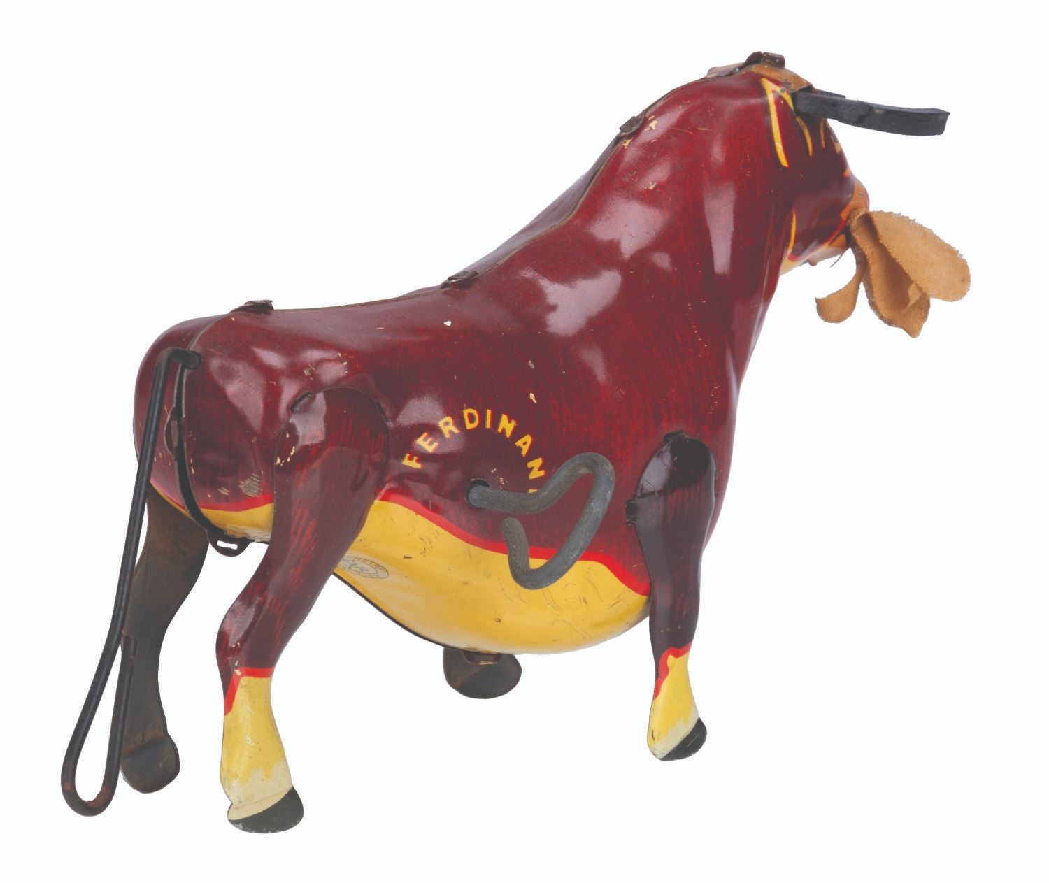 (Marx, 1938) A Ferdinand the Bull wind-up tin litho toy manufactured by Marx. When wound, Ferdinand moves, and his metal tail swings in circles. The toy, which has been tested and is in working condition, still has the rarely-retained original fabric flower held in Ferdinand's mouth. Measuring 4.25" x 6.5", the toy is in very good condition with scratches, scuffs, and wear on the flower from age.