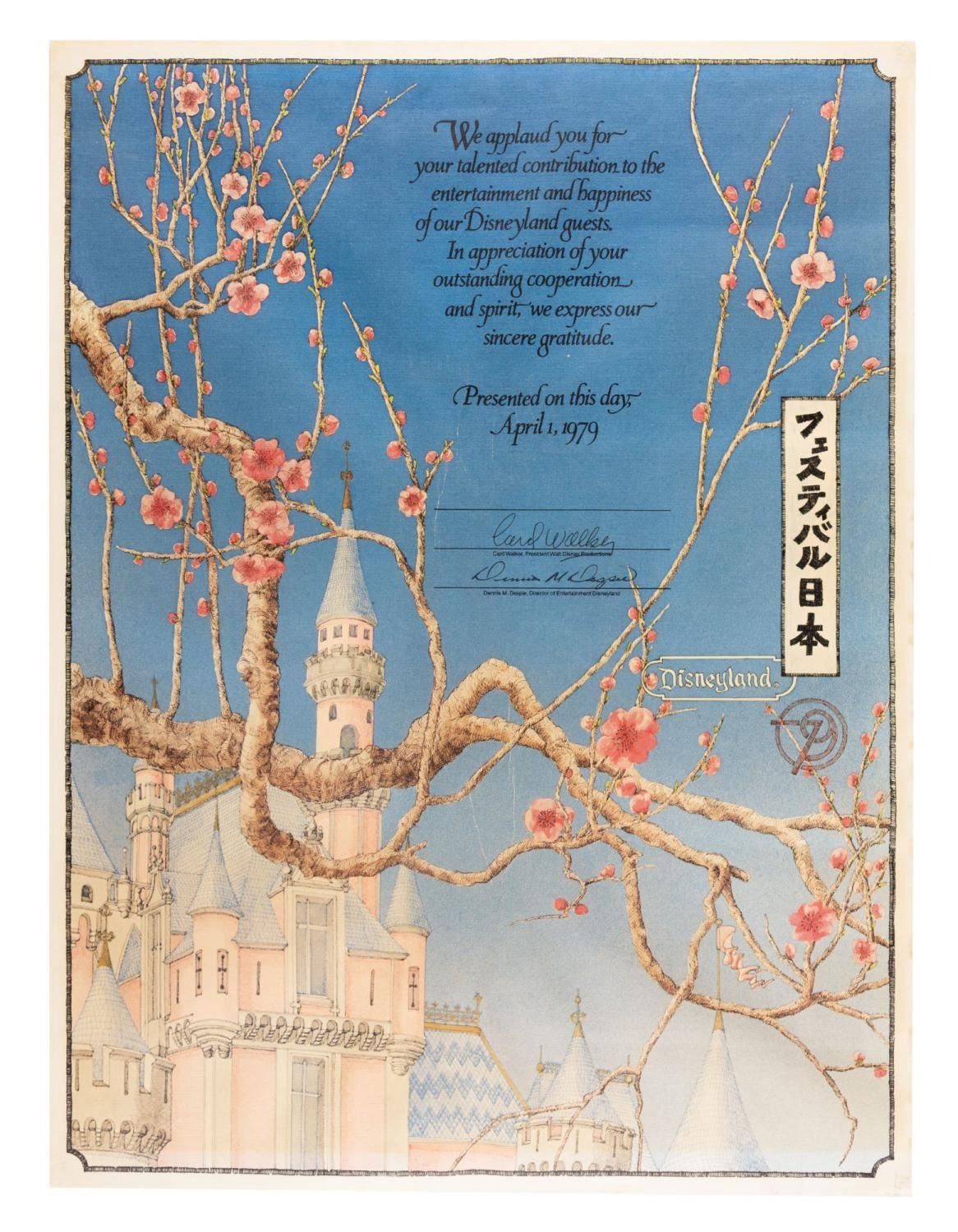 (Disneyland, 1979) An oversized honorary certificate given to Cast Members during the third year of Festival Japan and featuring facsimile signatures of Card Walker and Dennis Despie. Measuring 15" x 20", the certificate is in good condition with light wear throughout and overall color shift from display.