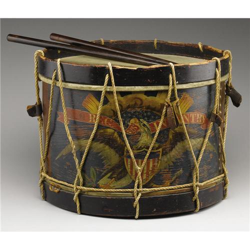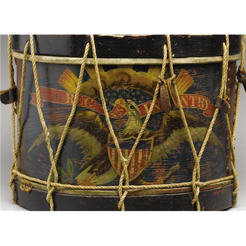 <B>A Field Drum of the 41st US Infantry - Rice's Station Against Longstreet</B></I> This wonderful field drum of the 41st US Infantry has a spectacular spread-winged eagle with the federal shield and ribbon painted on its shell. While it has seen much use in the field, the drum is rugged and striking in the image that remains with the ribbon bearing the designation '41 Reg. US Infantry' in the eagle's beak.<BR> At 16 1/2" in diameter, the drum's upper head is in good condition with no tears. While the bottom head snares are present, the head skin is torn across the diameter of the drum. On the opposite side of the regimental eagle is an elaborate design of brass tacking where the snare tension brass is still present. The ropes are present as are the seven leather tighteners. Made of highly-grained maple, this drum is very distinctive in appearance with some flaking of the painted image and tension wear at the rims. The drum comes with a pair of period mahogany drumsticks. <BR>The 41st US Infantry under Colonel Llewellyn Haskell fought admirably at Rice's Station where they engaged Confederate General James Longstreet forcing his withdrawal.<BR><BR><b>Shipping:</b> Other (oversized items, group lo (<a target="_blank" href="http://www.heritageauctions.com/common/shipping.php">view shipping information</a>)