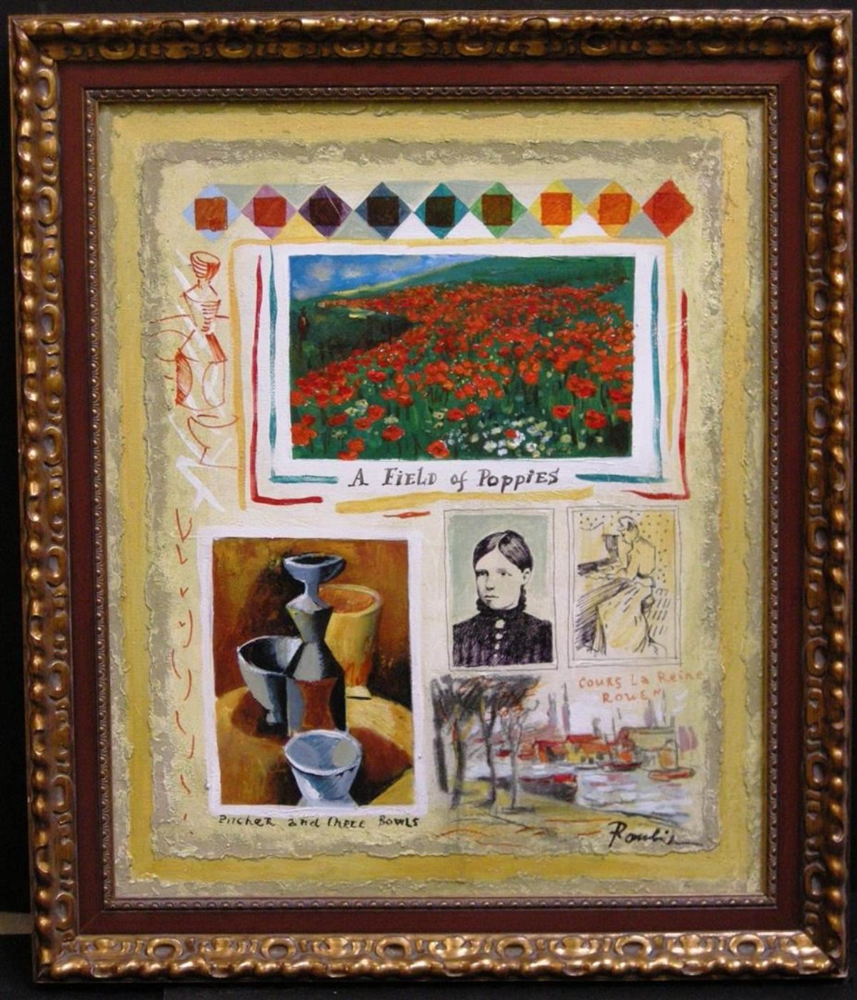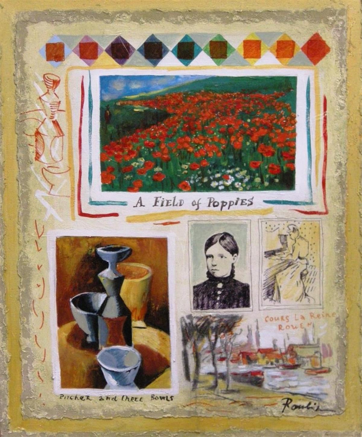 Olga Roubin's distinctive style of painting is seen in this collage of several images, including a field of red poppies, a turn-of-the-century young woman, Pitcher and Three Bowls and the Course La Reine along the River Seine. Oil on canvas measures 23.5