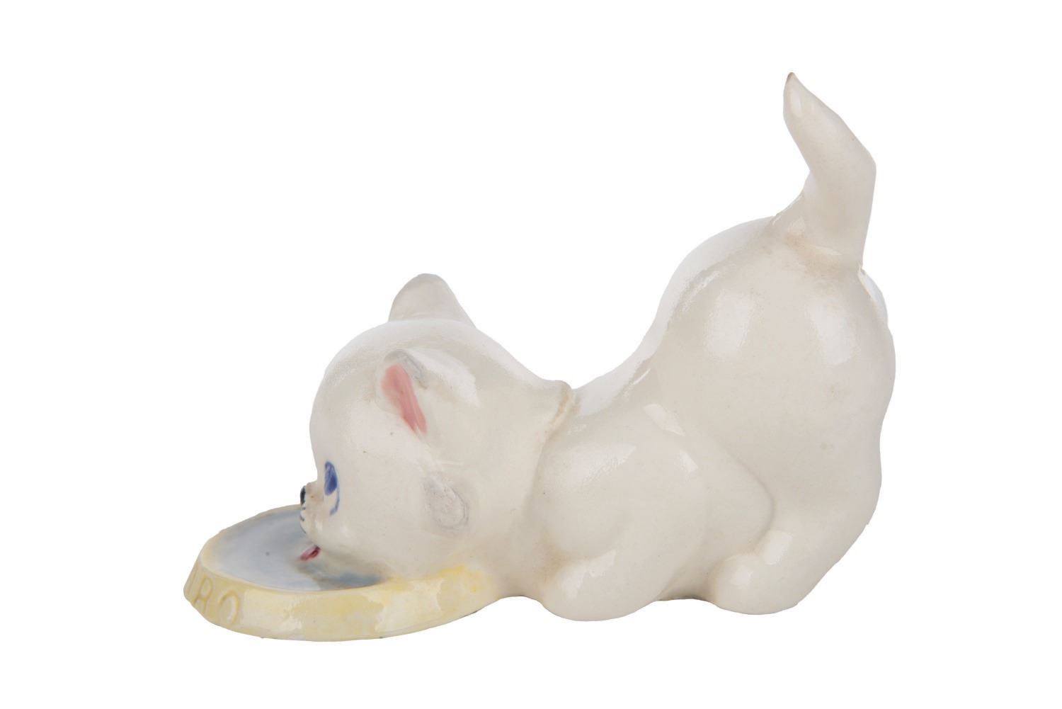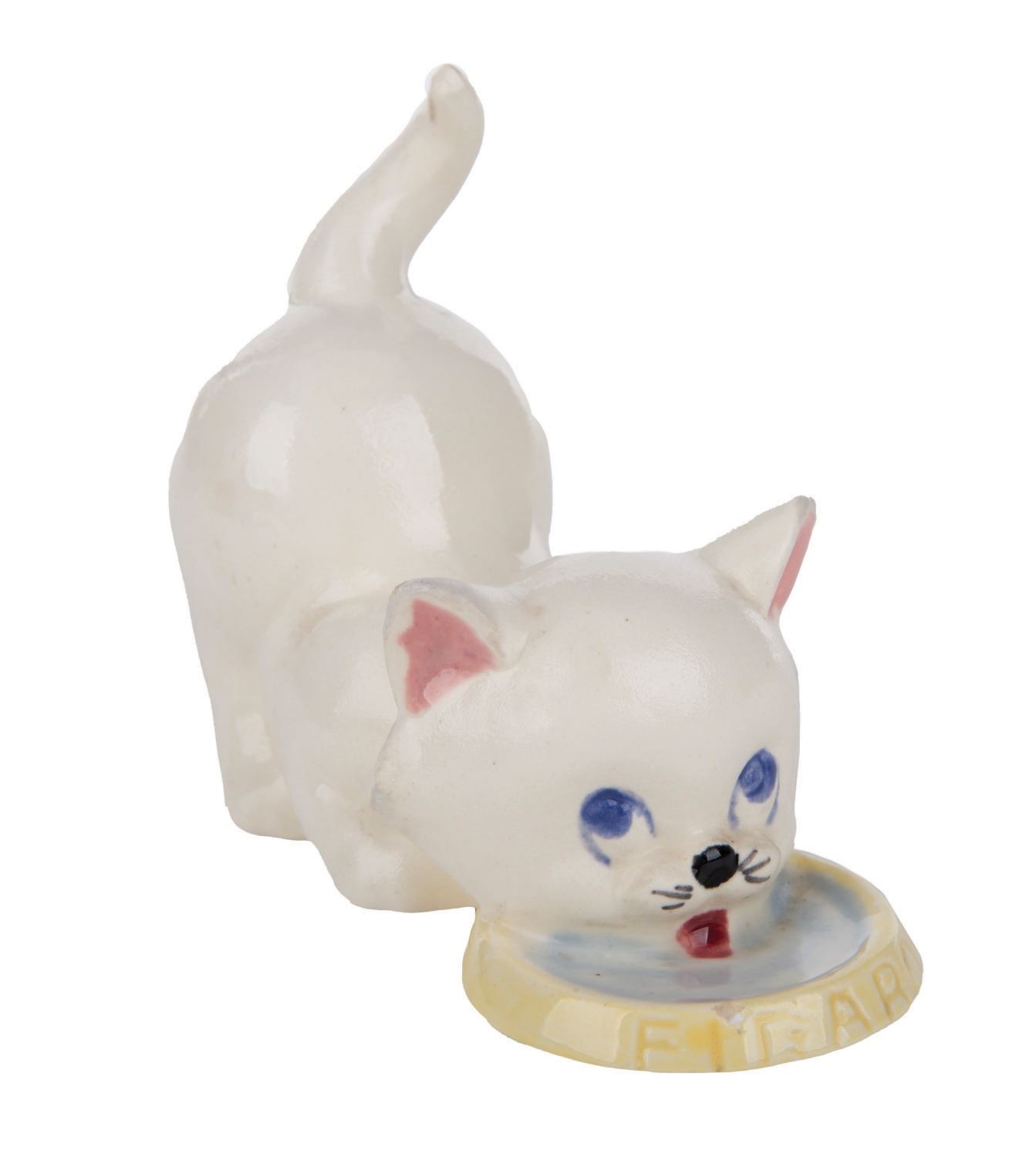 (Japan, 1950s) An unusual glazed ceramic figurine of Figaro. Most likely produced in Japan in the 1940s, the design is taken from an earlier ceramic produced by Brayton Laguna. Measuring 4.5"x3.5" tall, the figurine has been painted white rather than Black and White as would be expected. It is in good condition with light wear and soiling.