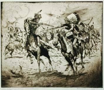 A Fight Between Sioux and Cheyenne by Edward Borein "9 15/16 x 11 7/8" Etching and Dry Point signed and insribed "Blackfoot Indians Montana" RARE