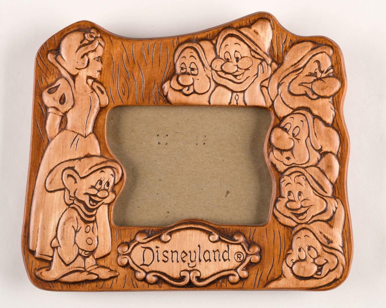 (Disneyland, 1970s-80s) An original souvenir faux wood frame inspired by "Snow White and the Seven Dwarfs." Featuring a relief rendering of Snow White and the Dwarfs, the 8" x 6.75" frame has an opening measuring 3" x 4". The frame is in very good condition with minor surface wear to the velvet backing from age and handling.