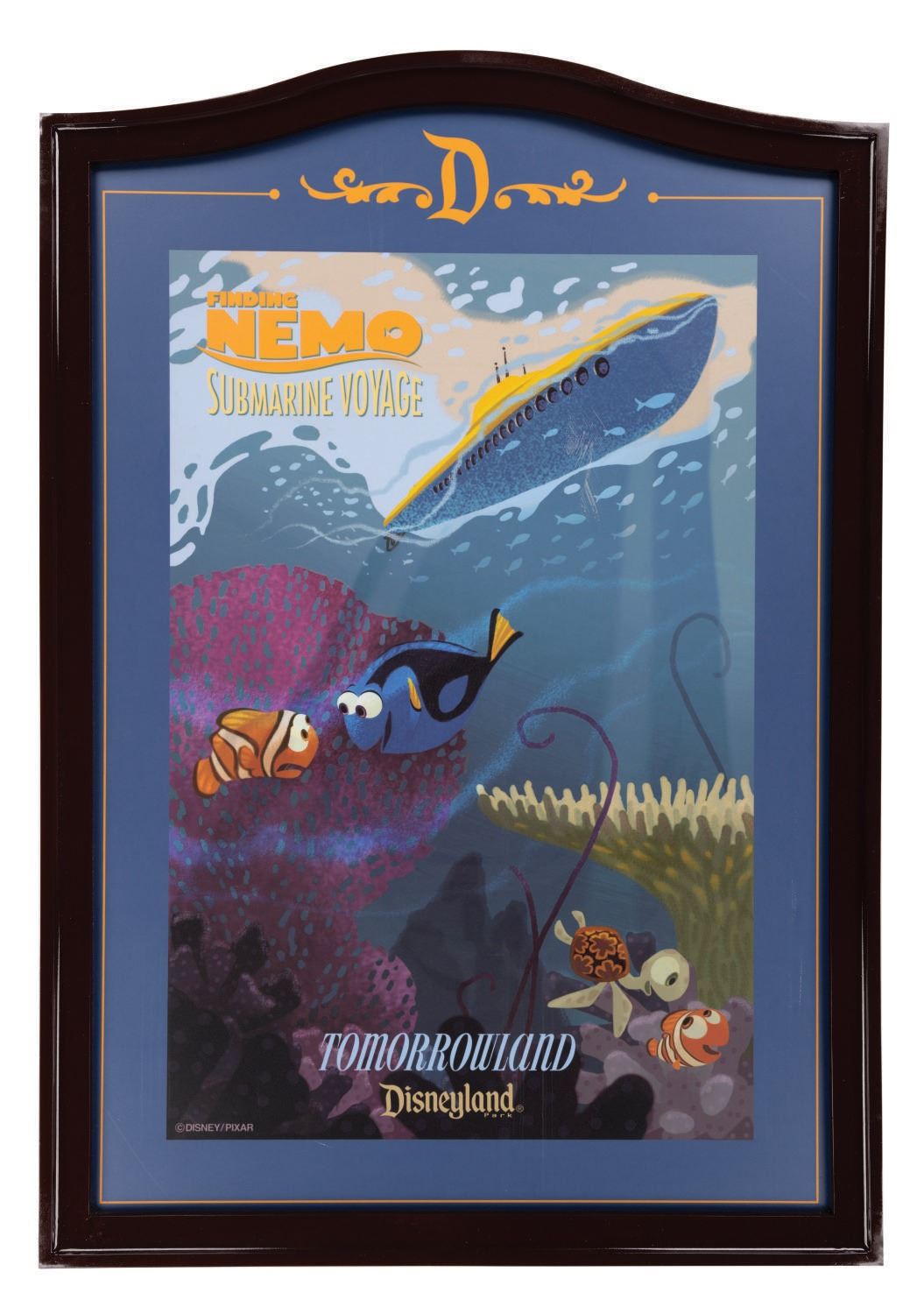 (Disneyland, 2000s) A rare Disneyland Backstage attraction poster prop for Finding Nemo Submarine Voyage. Rarely seen by Guests these were displayed in Backstage passages opened for Guest flow only during peak capacity times at the Park. This poster features Ralph Eggleston's original designs for the Finding Nemo Submarine Voyage attraction. The original poster measuring 42.25"x29" is presented within a 44.25"x31.25" reproduction frame, in fine Park-used condition with few light scuffs.