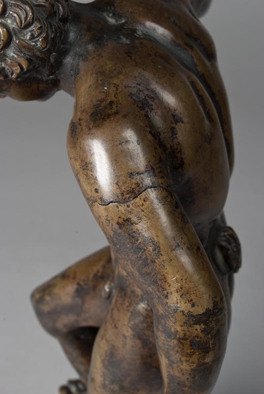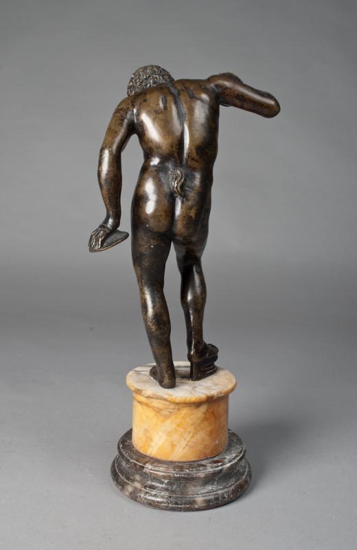 Finley cast to depict a figure of a cymbol player pumping a bellows with his right foot,mounted on marble socle, 11"H, not including the marble socle Italian or venetian 17th century, condition overall dimpling in bronze, four chips on marble socle and stand, sculpture is wobbly on stand, punctured hole to bottom of right rear, some scratches but overall good condition. Provinance on display at Colgate University for the past ten years, sold by Royal Athena Galleries New York in 1985, with appraisal from Jerome N. Eisenberg, Ph.D. dated October 22, 2009 with an appraised value of $15,200.00, appraisal on file.