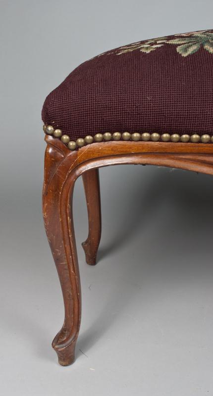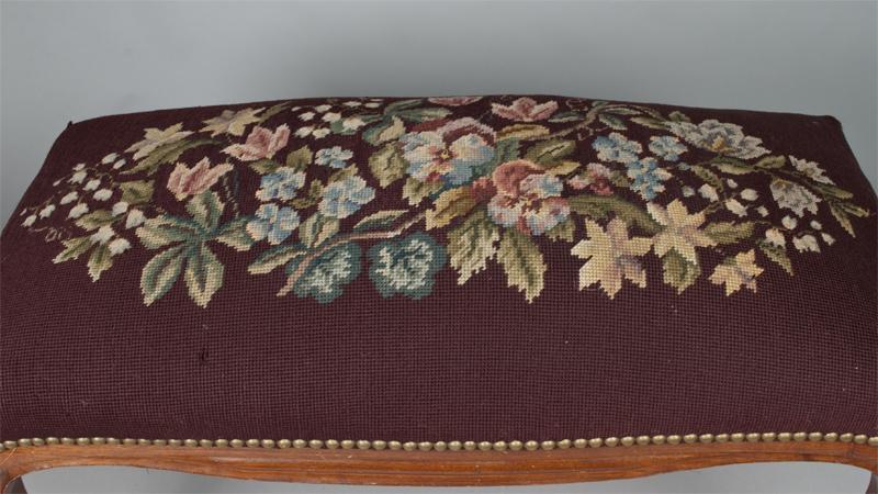 On four legs with beautiful needlepoint in burgundy with multi-colored floral swag, and brass tacks. 19" H x 30" L x 14.5" D. Nicks and abrasions to wood, some losses and pulls to needlepoint.