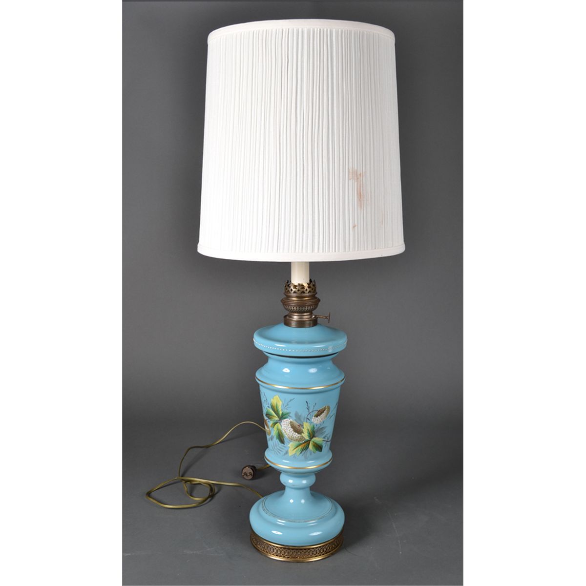 Finely enameled flowers and seed pods against an opaline robin egg blue ground, now converted to a lamp. Vase measures 16" H, the whole measures 35" H. Circa late 19th and early 20th century. Private collection Detroit, MI.