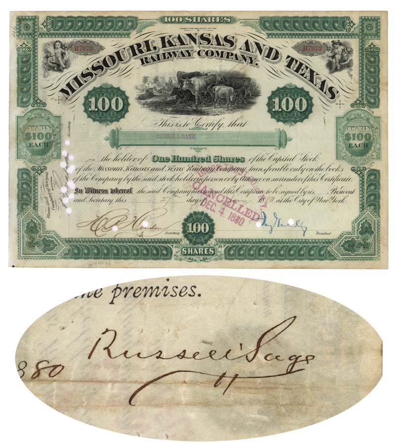 1880, Texas. Stock certificate for 100 shares. Green/Black. Engraved vignette of cattle at watering hole. Issued to and signed on verso by RUSSEL SAGE RUSSELL SAGE (1816 - 1906). Banker; financier; congressman. As the originator of "put and call options", Sage greatly changed the way speculators played the stock market. Among America's most powerful and wealthy bankers, he financed Jay Gould and made a vast fortune on the latter's stock manipulations. "Sage was one of the shrewdest and most conservative of all great financiers." (DAB) At one time he is said to have had $27,000,000 out on call loans. At the time of his death he left a fortune worth an estimated $70,000,000. Also Signed as president by JAY GOULD (1836 - 1892); Railroad magnate; Financier; Stock market manipulator. Gould began his rise by gaining control of a small Vermont railroad in 1860 at the age of 24. Over the next 10-15 years he made a fortune by buying and selling railroads and manipulating their stock. His most famous railroad battle came in the late 1860's when, along with Jim Fisk and Daniel Drew, he struggled for control of the Erie Railroad against "Commodore" Vanderbilt. Gould went on to become "the most hated man in America" when his attempt to corner the gold market caused a panic termed "Black Friday" in September 1869. Turning towards western railroads in the 1870's, he came to own or control numerous roads, including the Union Pacific and Kansas Pacific. It is estimated that he controlled about 10% of the railroad track in the U.S. by 1880. He went on to gain control of the Western Union Telegraph Company, and the New York elevated railroad. At his death, his fortune was estimated to be $72 million. Very light browning along top edge. A couple of small, light ink stains affect nothing. Paper thinning at top left near attached stub lightly affecting border. Stamp and punch cancellations, the latter affecting Gould's signature.