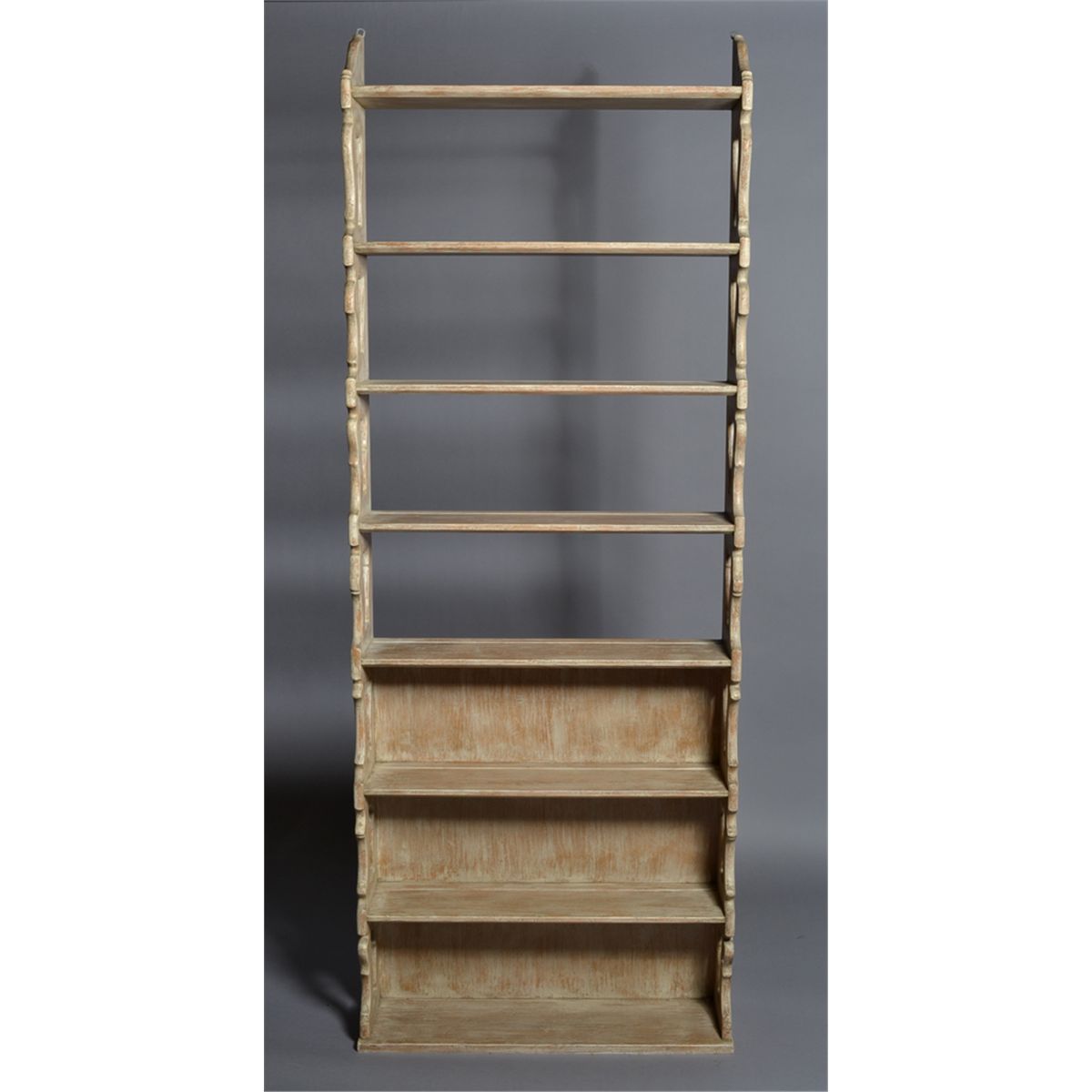 In distressed finish, with eight shelves with plate grooves, scalloped edges and cut outs on sides. Reinforceable hooks to top edges. Bears Baker ® metal tag on back. 80" H x 30" W x 7" D. Circa 20th century. Private collection Detroit, MI.