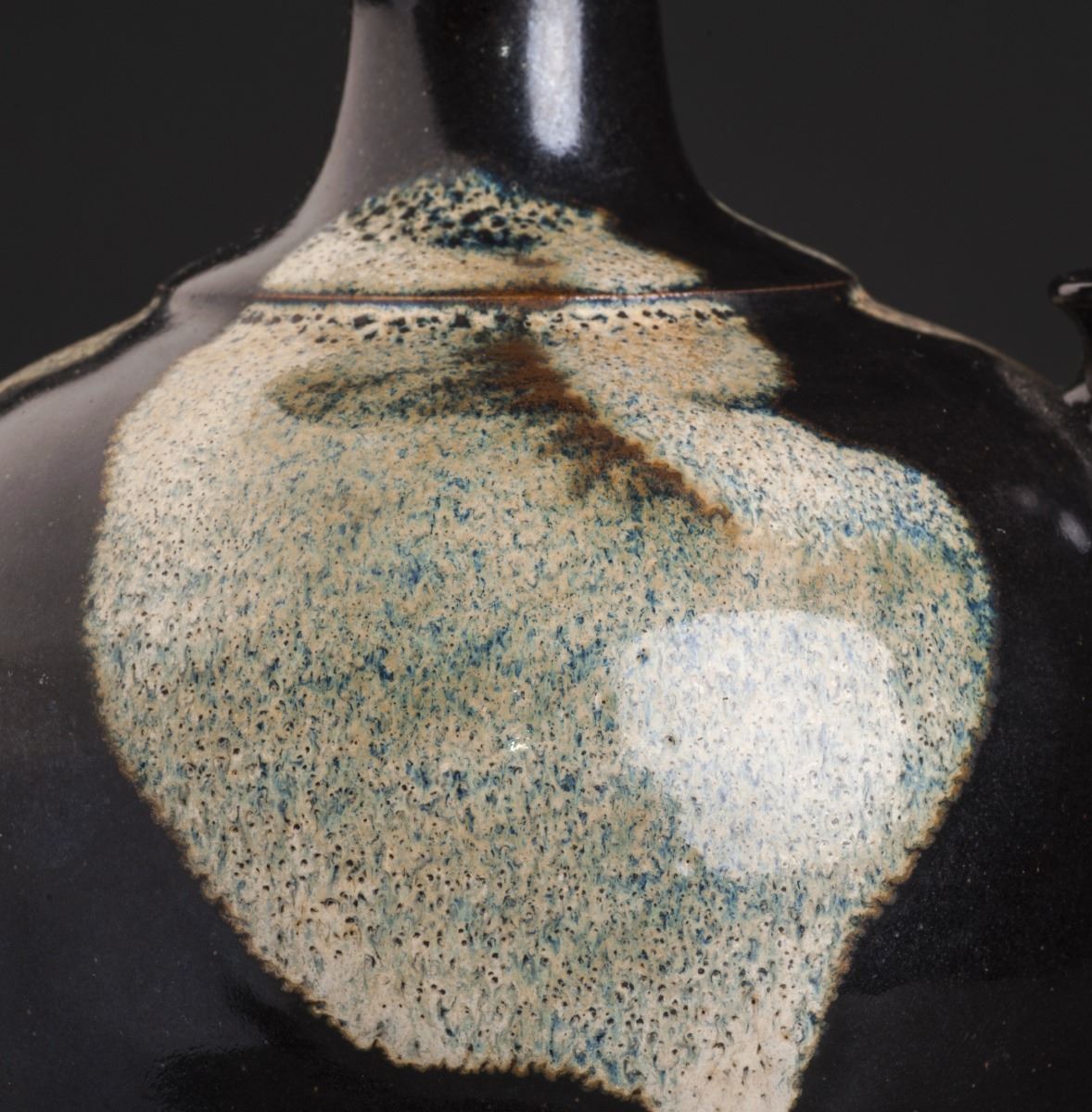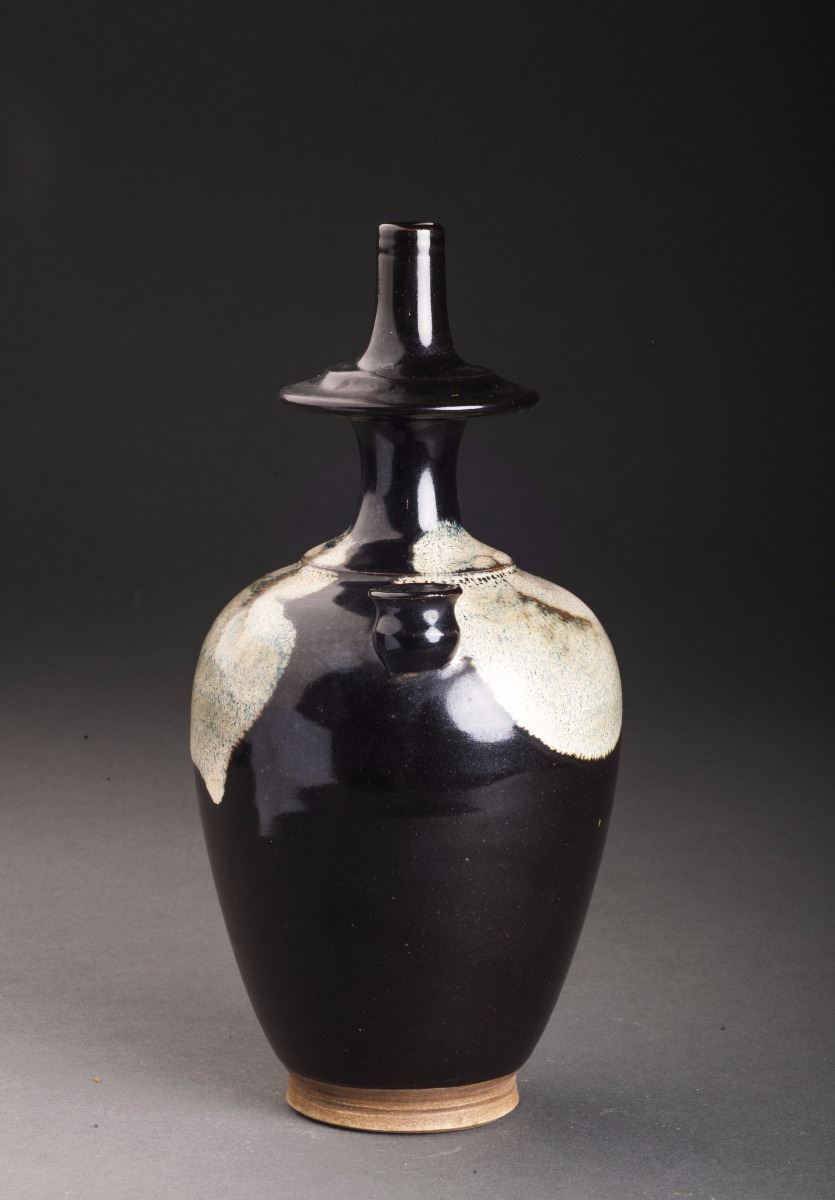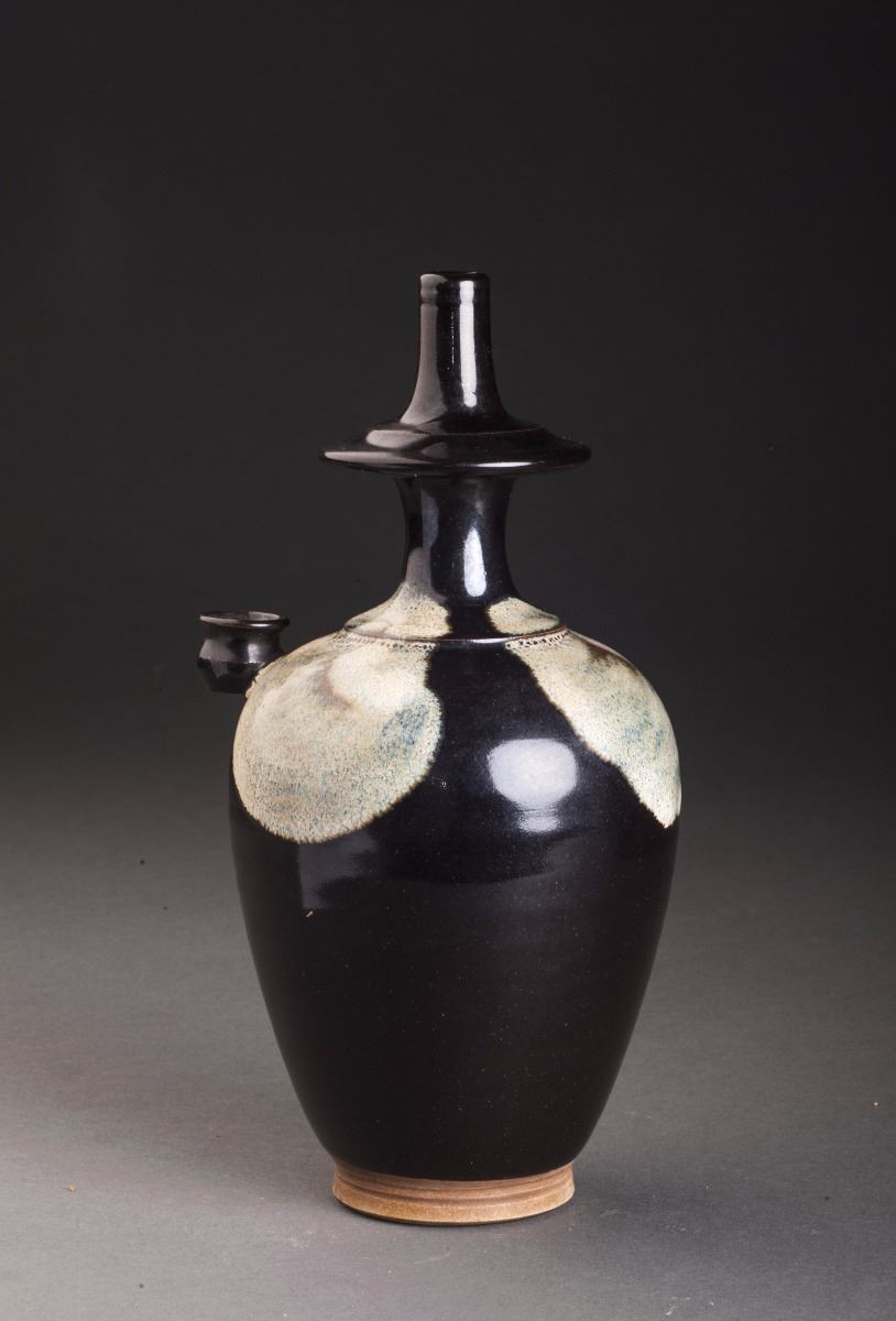 A Fine And Rare Black Glazed Porcelain Pot, With Fine Designed Matched High Cover And A Short Sprout. Heavily Potted Rim At The Mouth. With The Fading Rich Purple And White Colorful Stain On The Finely Potted Cavetto.Raised On The Flat Foot Down The Bottom.