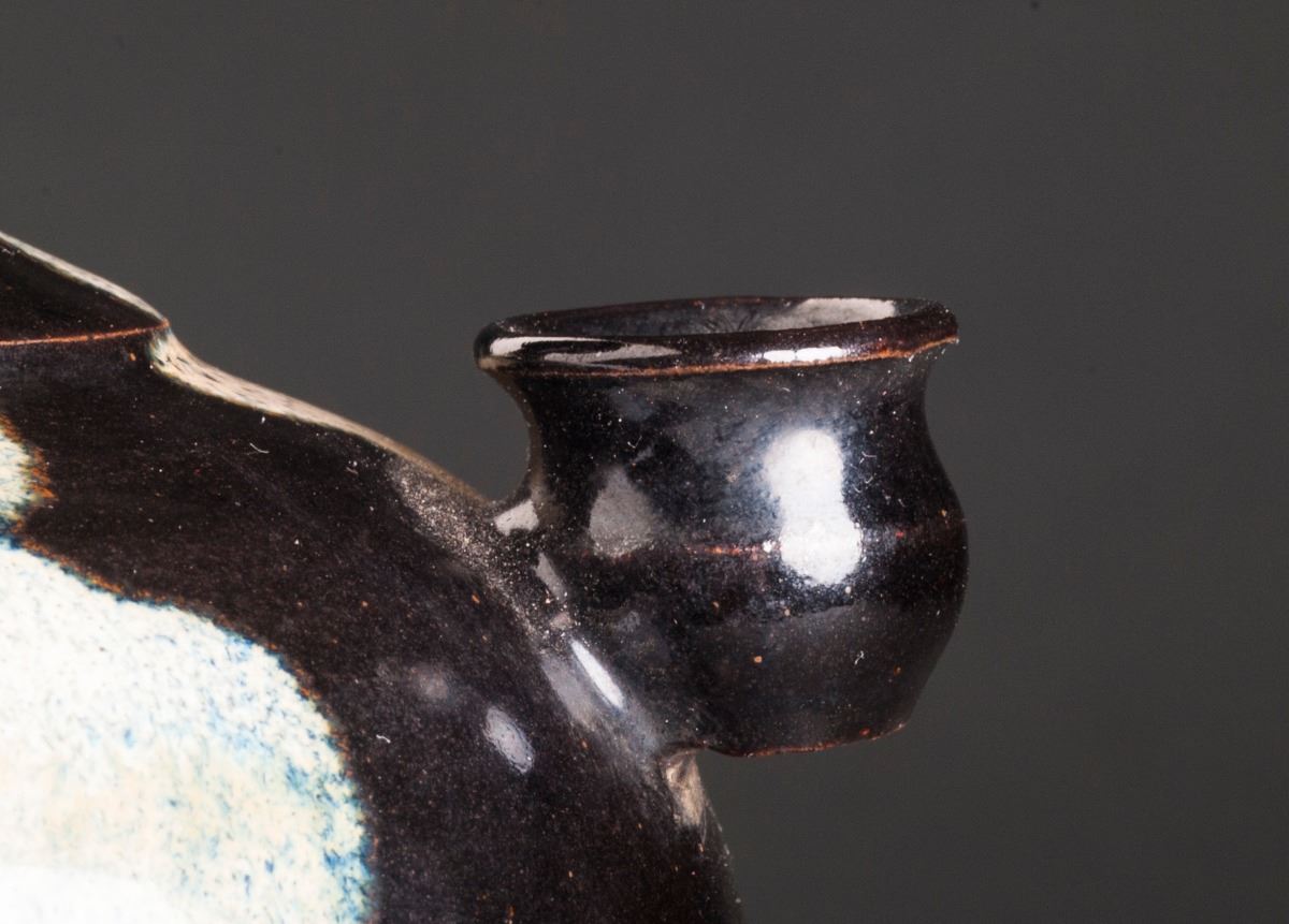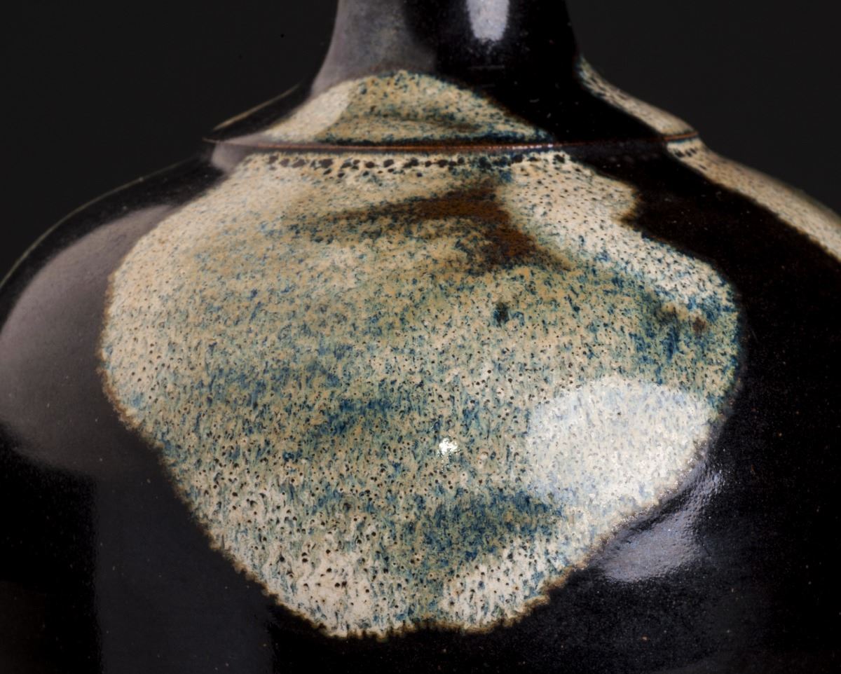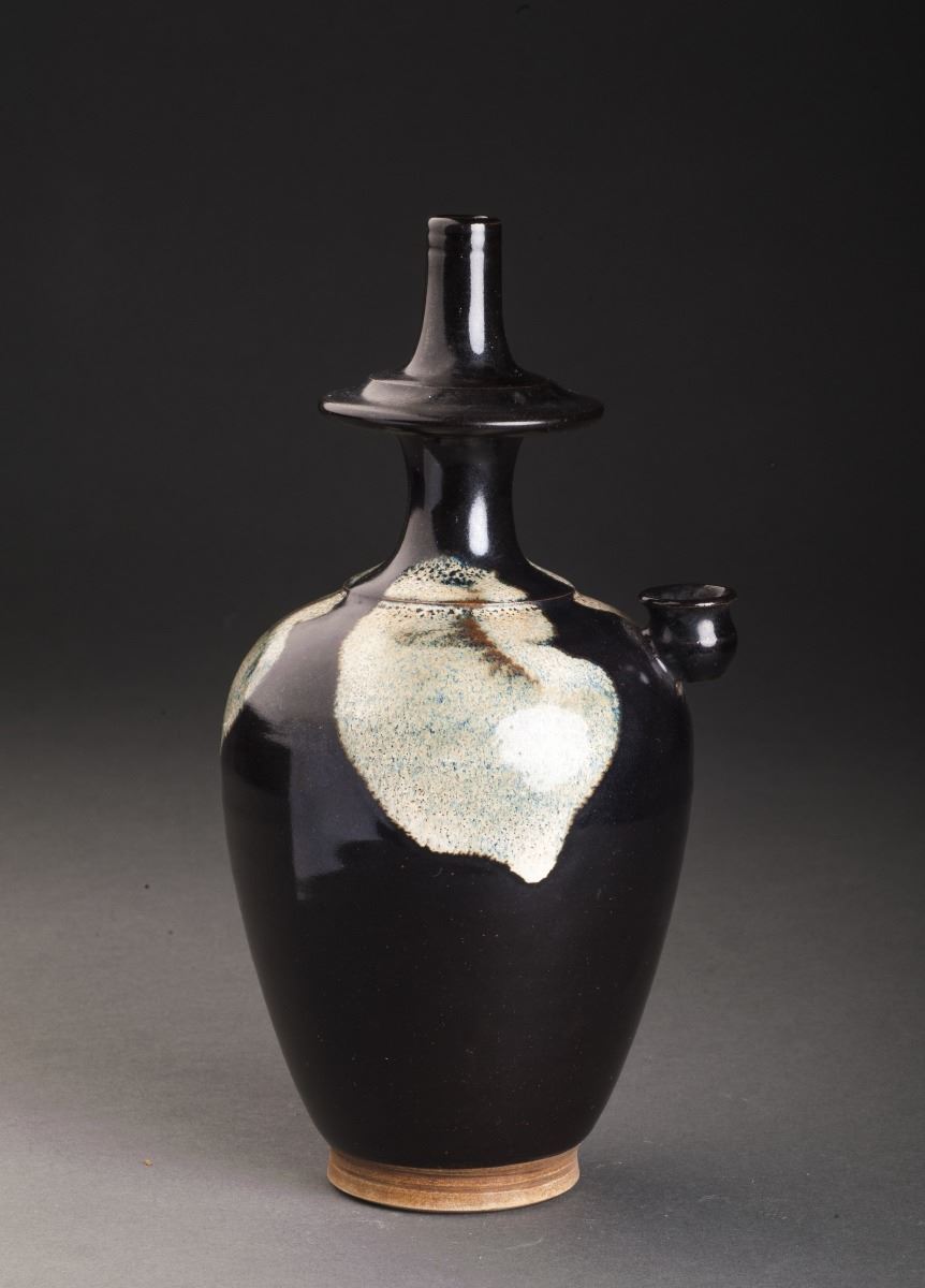 A Fine And Rare Black Glazed Porcelain Pot, With Fine Designed Matched High Cover And A Short Sprout. Heavily Potted Rim At The Mouth. With The Fading Rich Purple And White Colorful Stain On The Finely Potted Cavetto.Raised On The Flat Foot Down The Bottom.