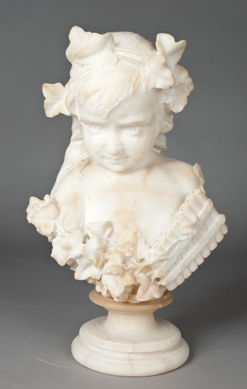 Finely carved to depict a little girl with floral headpiece, mounted on a circular socale. 18" H x 12" W, circa early 20th century.