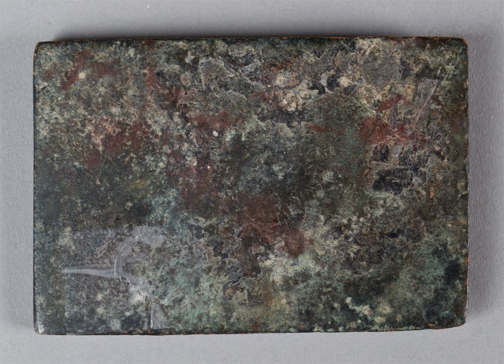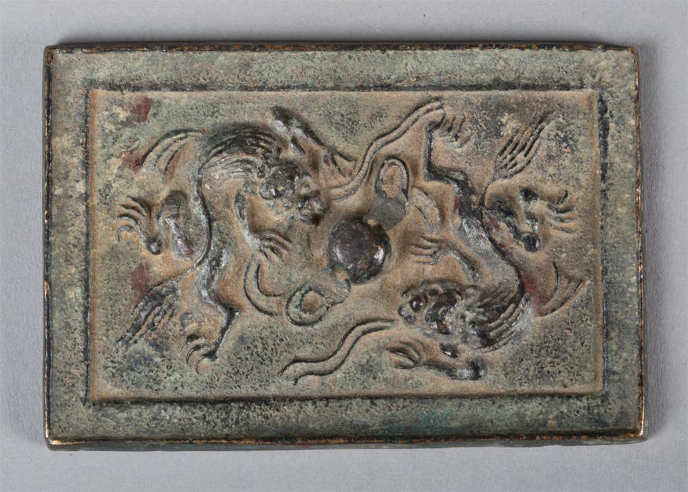 Finely chased to depict two raised chilong chasing a flaming pearl, of rectangular form. 3.25" L x 2.25" W, circa 200 B.C to 600 A.D.