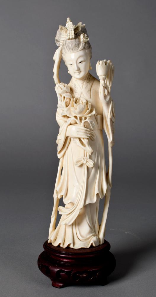 Finely carved to depict a beauty holding a sprig of flowers in each hand fully robed with fitted hardwood base with ink decoration and very finely carved, 9"H not including the stand early 20th century.