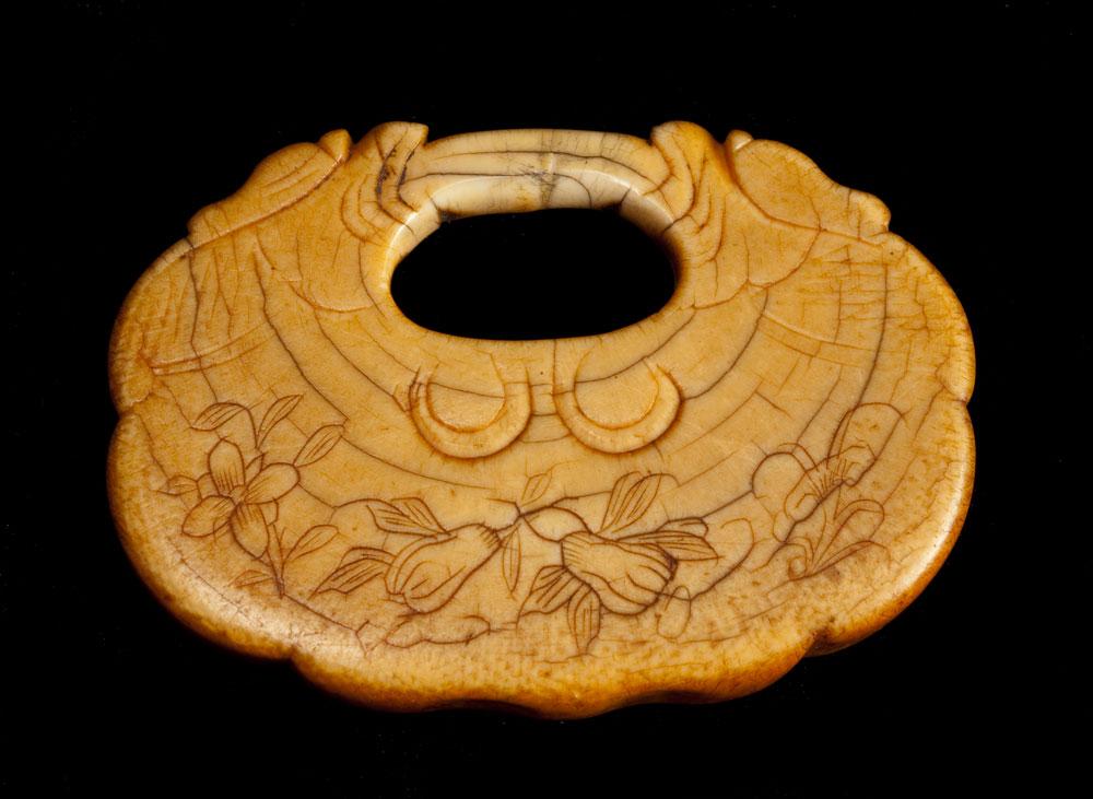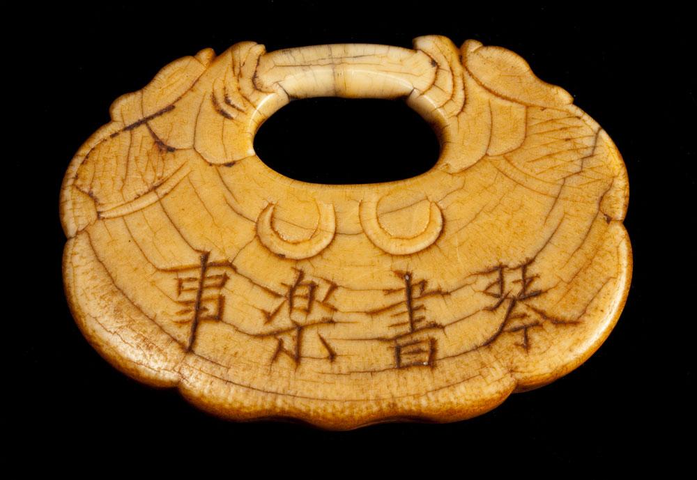 The lock form plaque finely carved on both sides to depict open mouth dragons gripping the handle. One side carved with fruit and flowers, the reverse carved with four Chinese characters. 2.125" W. Circa 18th Century. Private collection Dearborn, Michigan.