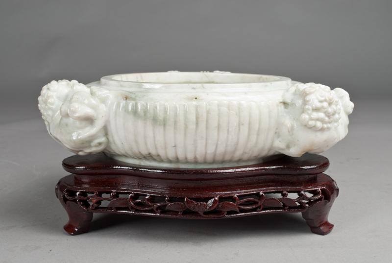 Finely carved with three raised foo dogs, the body with ribbed designs, the stone a light celadon with apple green inclusions, with fitted carved hardwood stand, 9.5"D X 3.25"H, not including the stand, circa early 20th century.