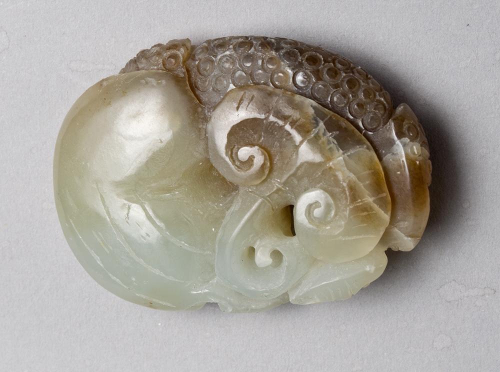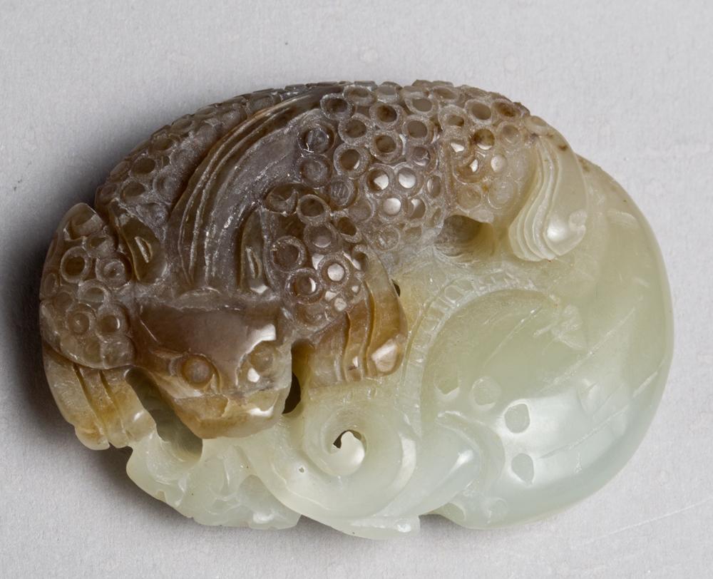 Finely carved to depict a mythical beast, ruyi and gourd. 1 & 7/8" L, circa 20th century.