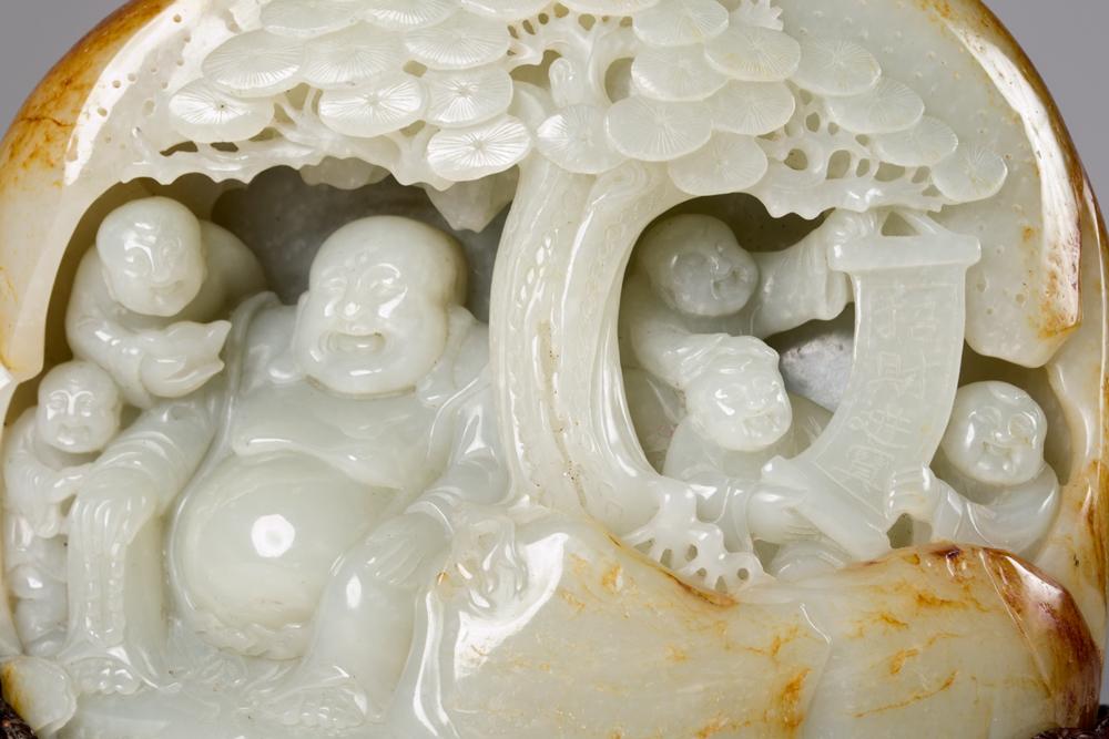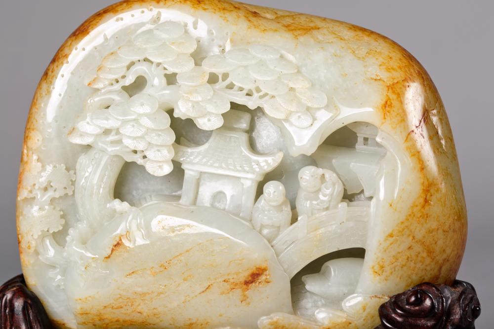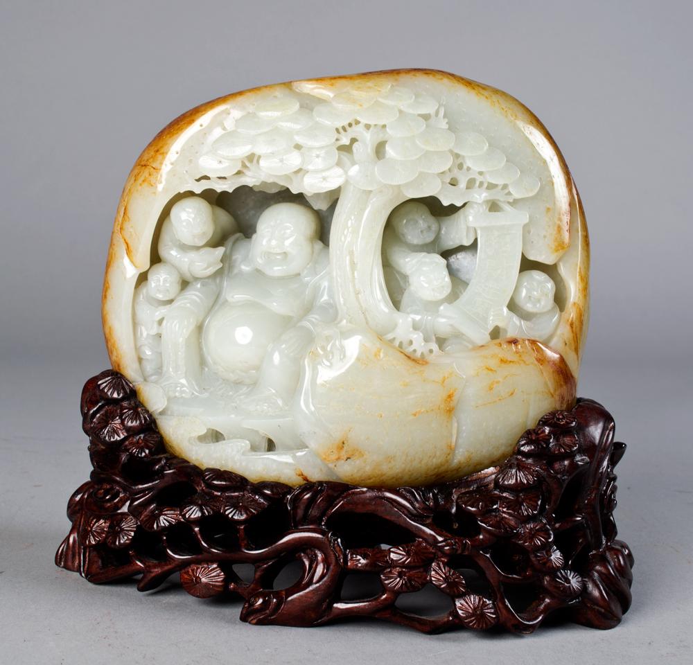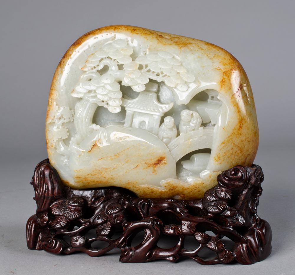 Finely carved on both sides one side carved to depict a buddha surrounded by children holding a banner beneath an ancient pine tree, the reverse carved with figures within a village with boats and houses beneath and ancient pine tree the stone a light to medium celadon with exceptionally fine polish and russet skin to the exterior with fitted hardwood stand finely carved to depict lingzi, 6"H X 6.75"W not including the stand circa late 19th-early 20th century.