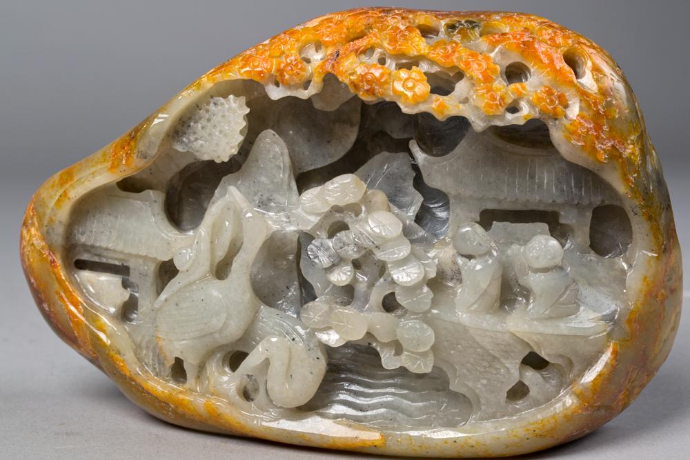 Finely carved to one side to depict figures, cranes, buildings and trees. 4.5" H x 7" L. Circa 20th century.