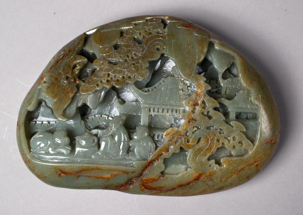 Finely carved to one side to depict two figures fixing tea with a dog, beneath trees and with buildings in the background. 5.5" H x 7.75" W, circa 20th century.