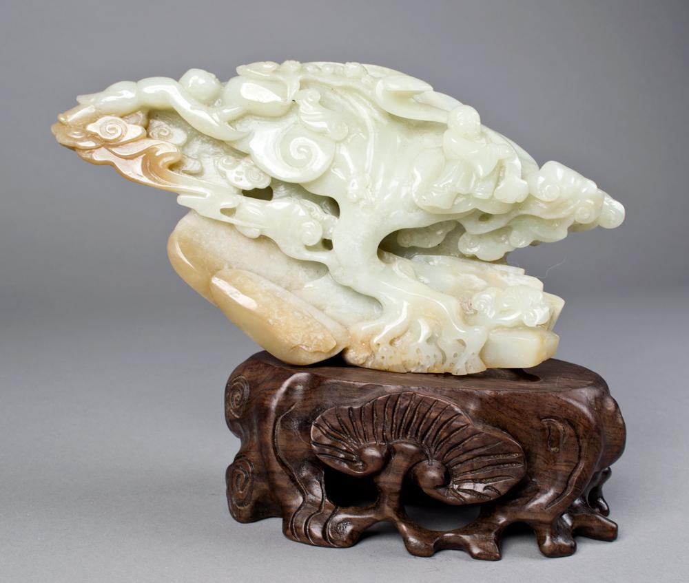 Finely carved on both sides to depict two small figures holding ruyi scepters and extending to form a tree. On custom hardwood stand. 4.75" H x 8.75" W, not including the stand. Circa 20th century.
