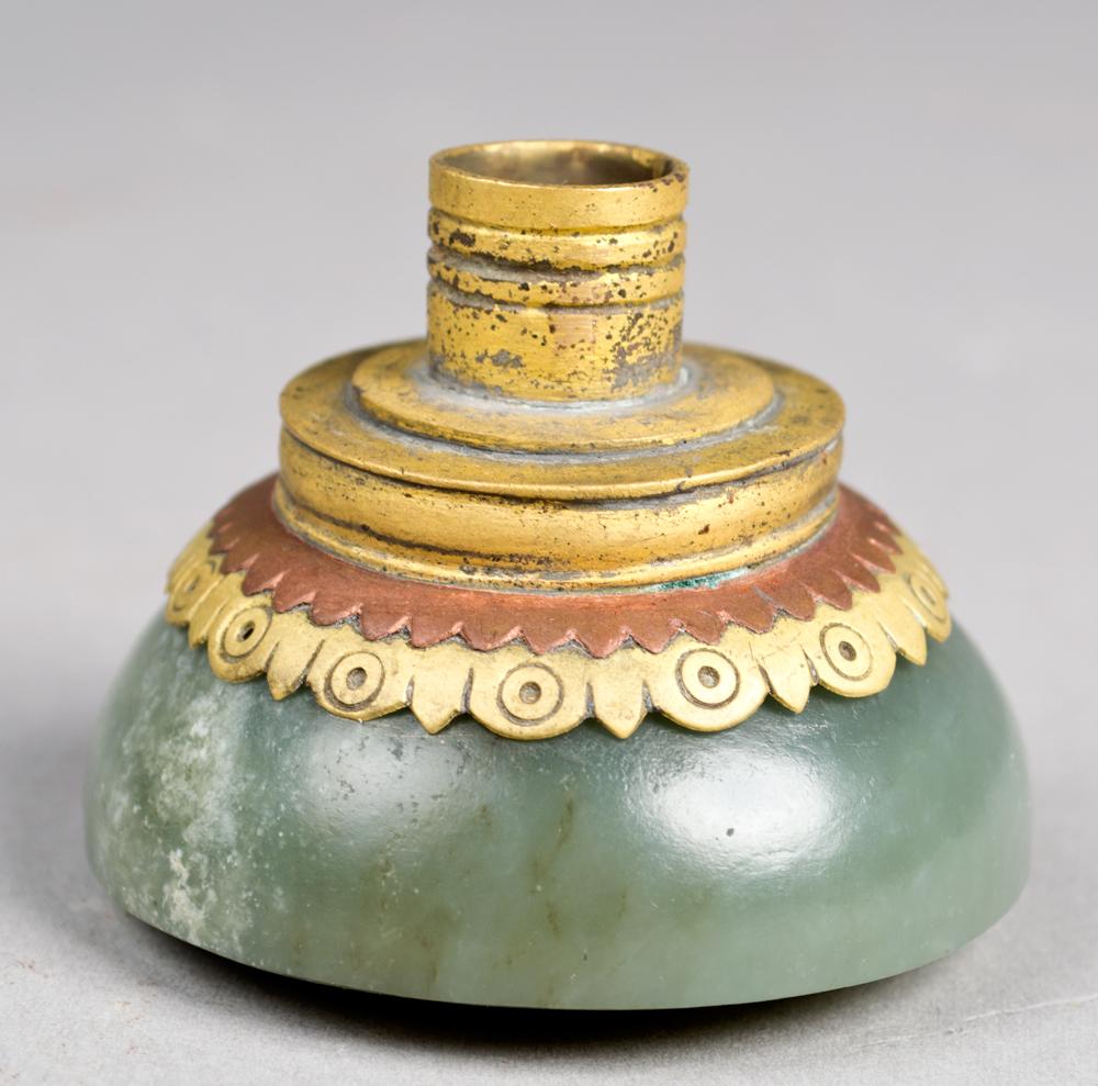 With gilt metal or bronze mounts, the stone a transluscent spinach green with fine polish. Probably a pipe fitting. The center pierced with breathing hole. 1.625" H x 2.125" Dia. Circa 19th century. Breather hole with opium residue.