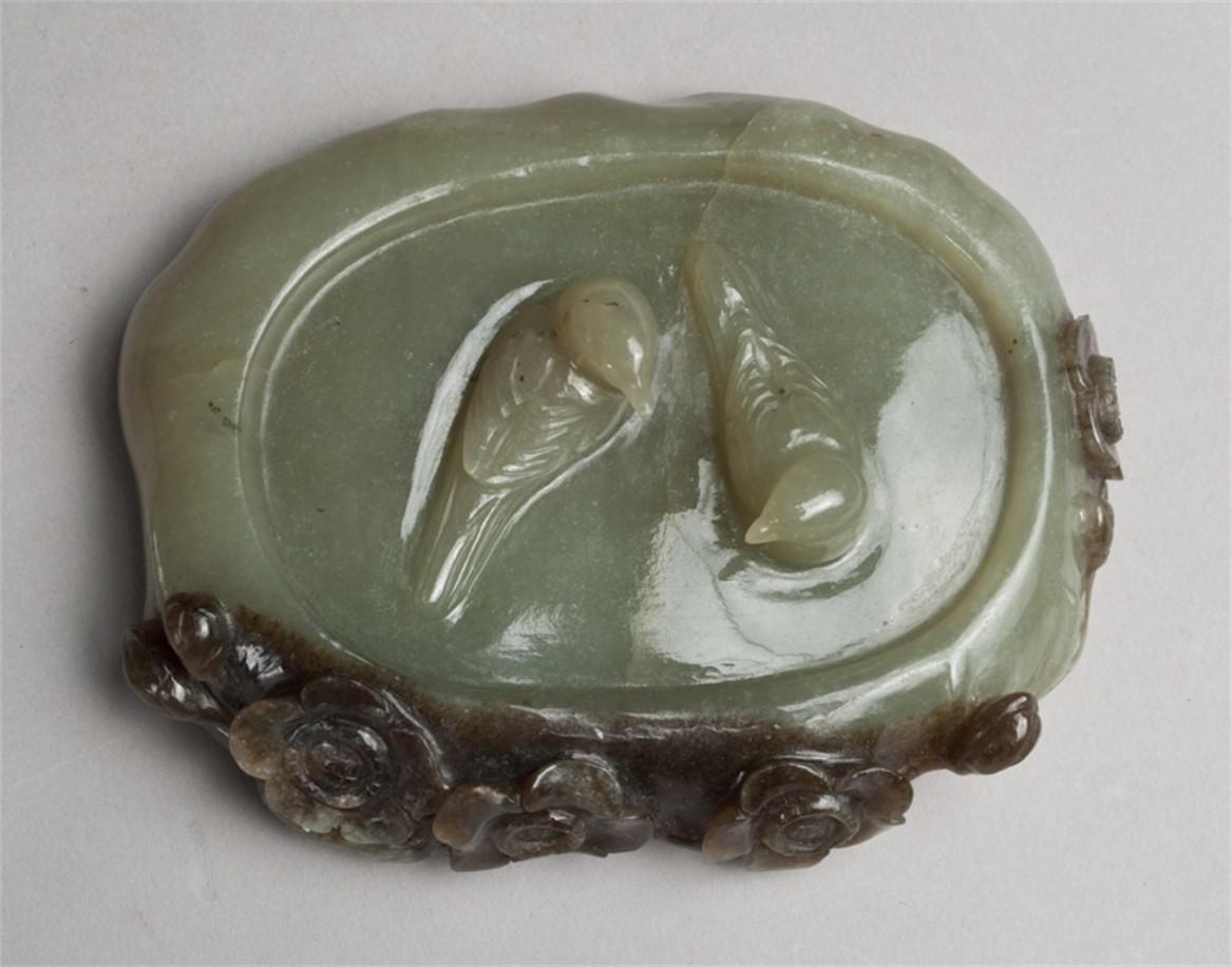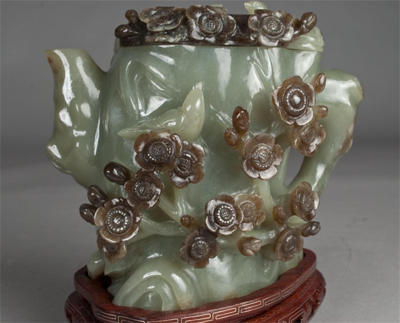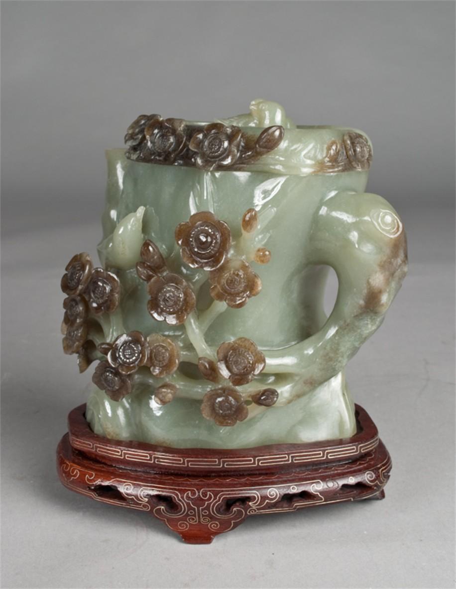 Finely carved to depict a tree trunk with flowers and birds, the stone a green celadon, the flowers carved in russet, with a very fine polish and custom wood inlayed with brass stand, 5.5"H X 6.75"W not including the stand.