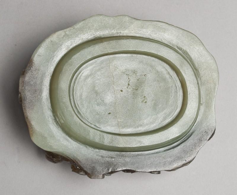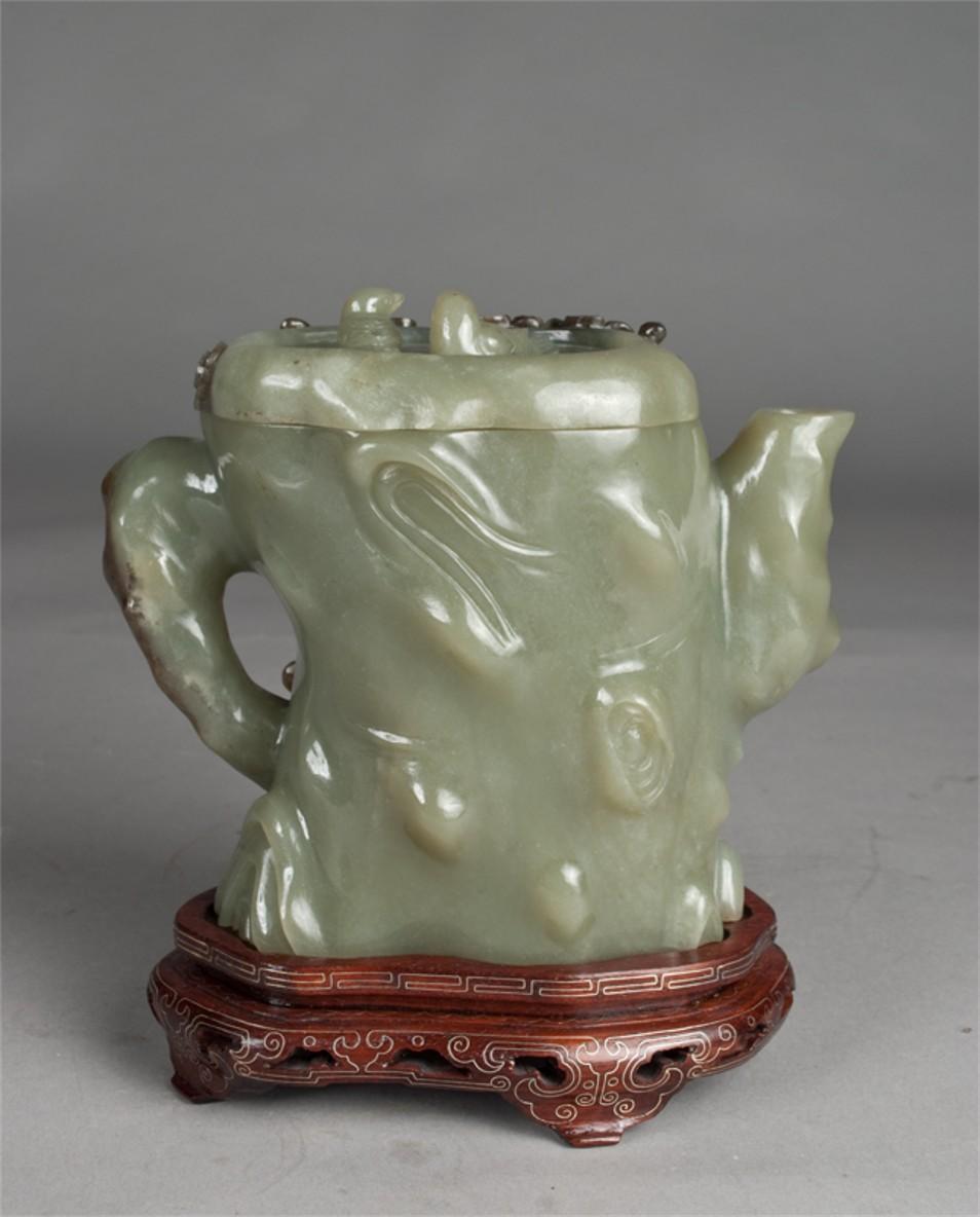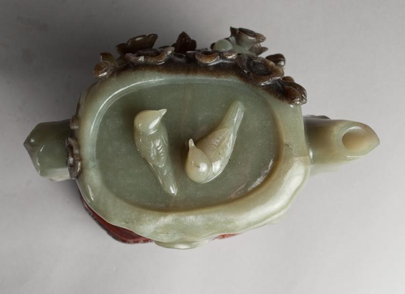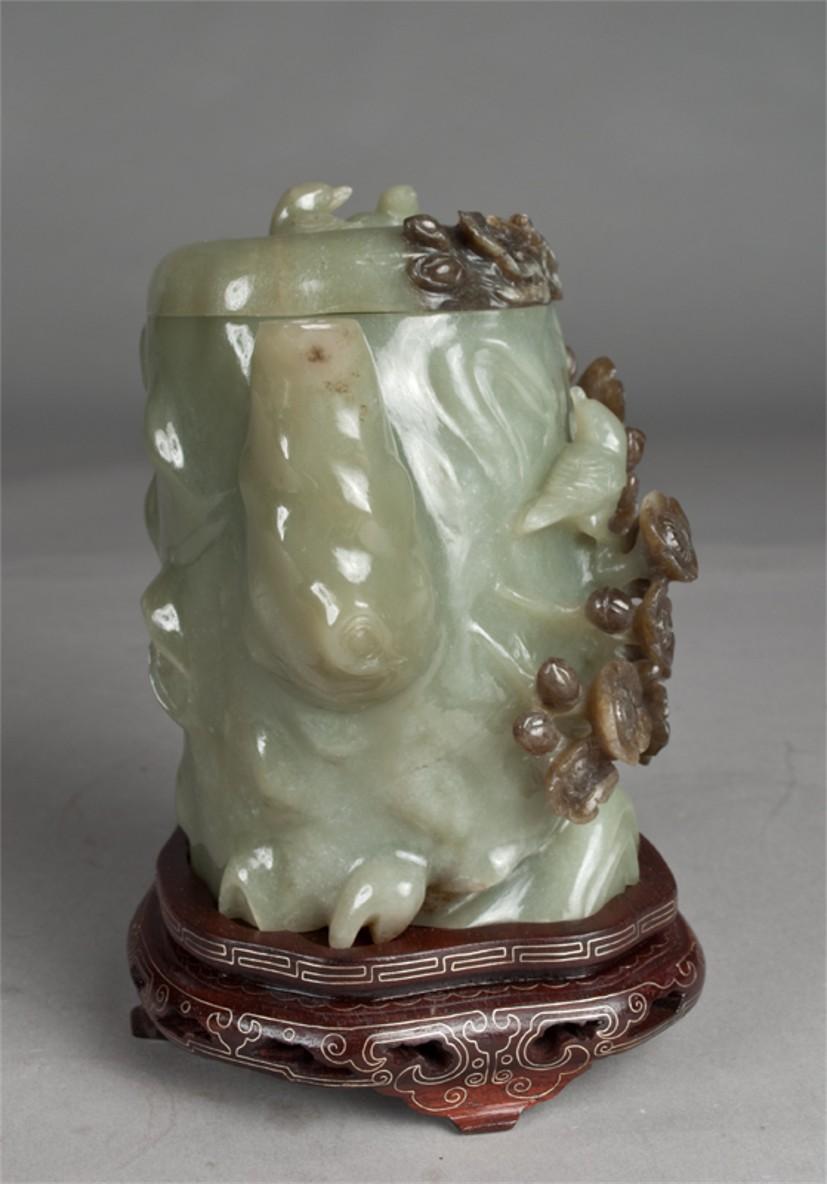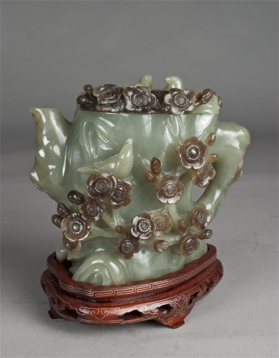 Finely carved to depict a tree trunk with flowers and birds, the stone a green celadon, the flowers carved in russet, with a very fine polish and custom wood inlayed with brass stand, 5.5"H X 6.75"W not including the stand.