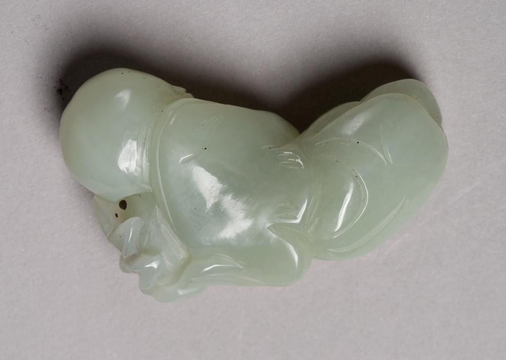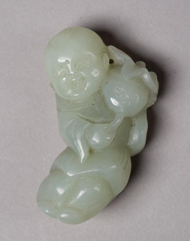 Finely carved to depict a youth holding a peach with flower. 2.5" L, circa 20th century.