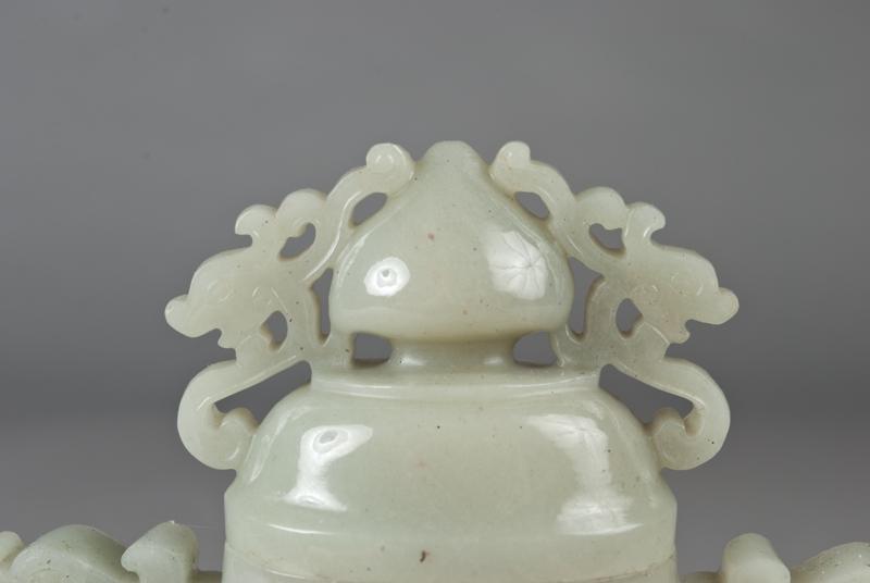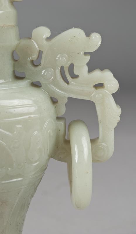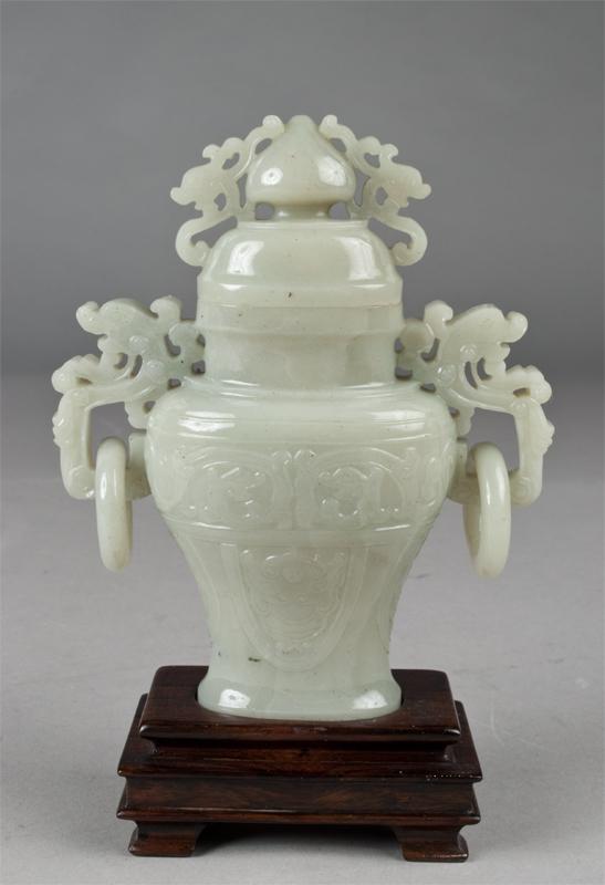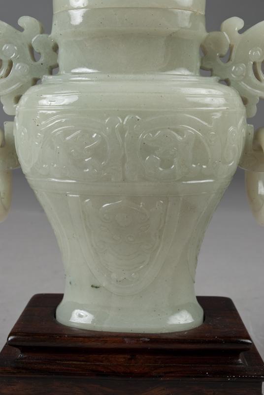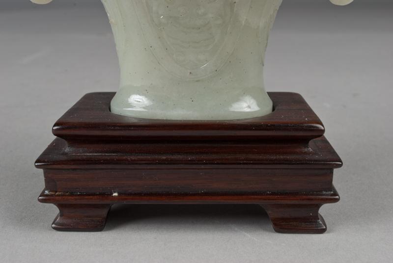 Finely carved to depict dragons, with two dragon shaped handles each having loose rings, raised on carved wood stand, 6:H, not including the stand.