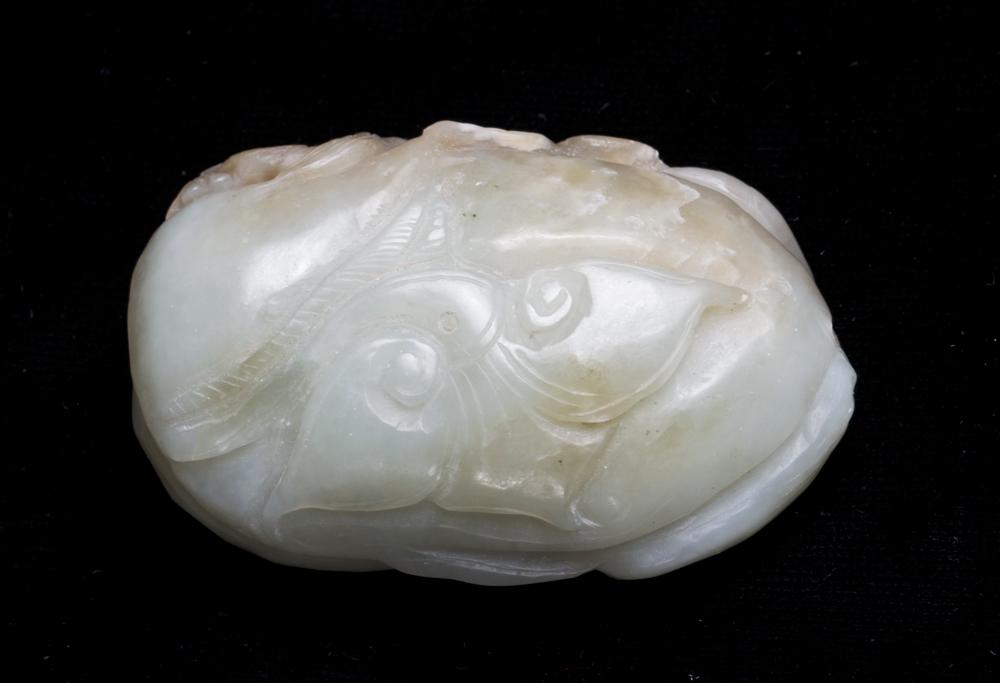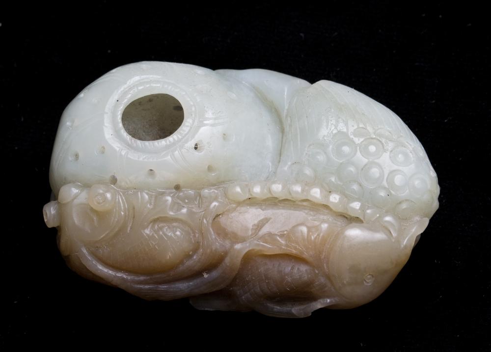 Small water dropper carved to depict fish and lotus on underside. 2 & 1/8" L, circa 20th century.