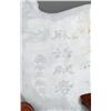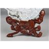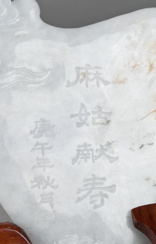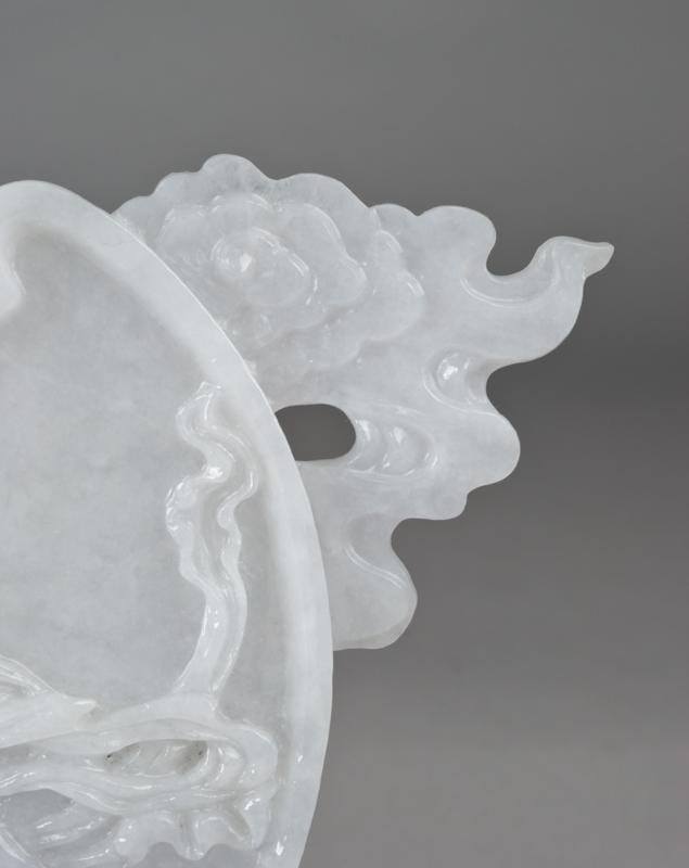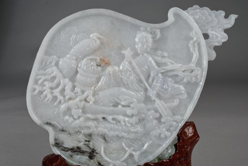 Finely carved to depict a fisher lady rowing a boat with crane and flower pots, the back with two line inscription, mounted on a custom carved hardwood stand with easel back, 8.375"W X 6.25"H not including the stand, circa 1940's.
